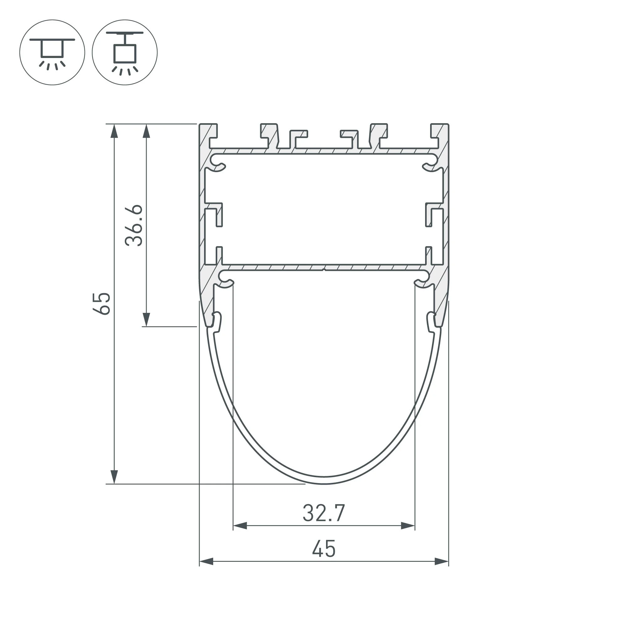 Алюминиевый анодированный профиль для светодиодных лент и линеек. Габаритные размеры профиля (L×W×H): 2000x45x36,6 мм. Габаритные размеры профиля с экраном (L×W×H): 2000x45x65 мм. Ширина площадки для ленты 32,7 мм. Экраны, заглушки и другие аксессуары приобретаются отдельно. Цена за 1 метр. Кратность заказа поставщику: 2 м.