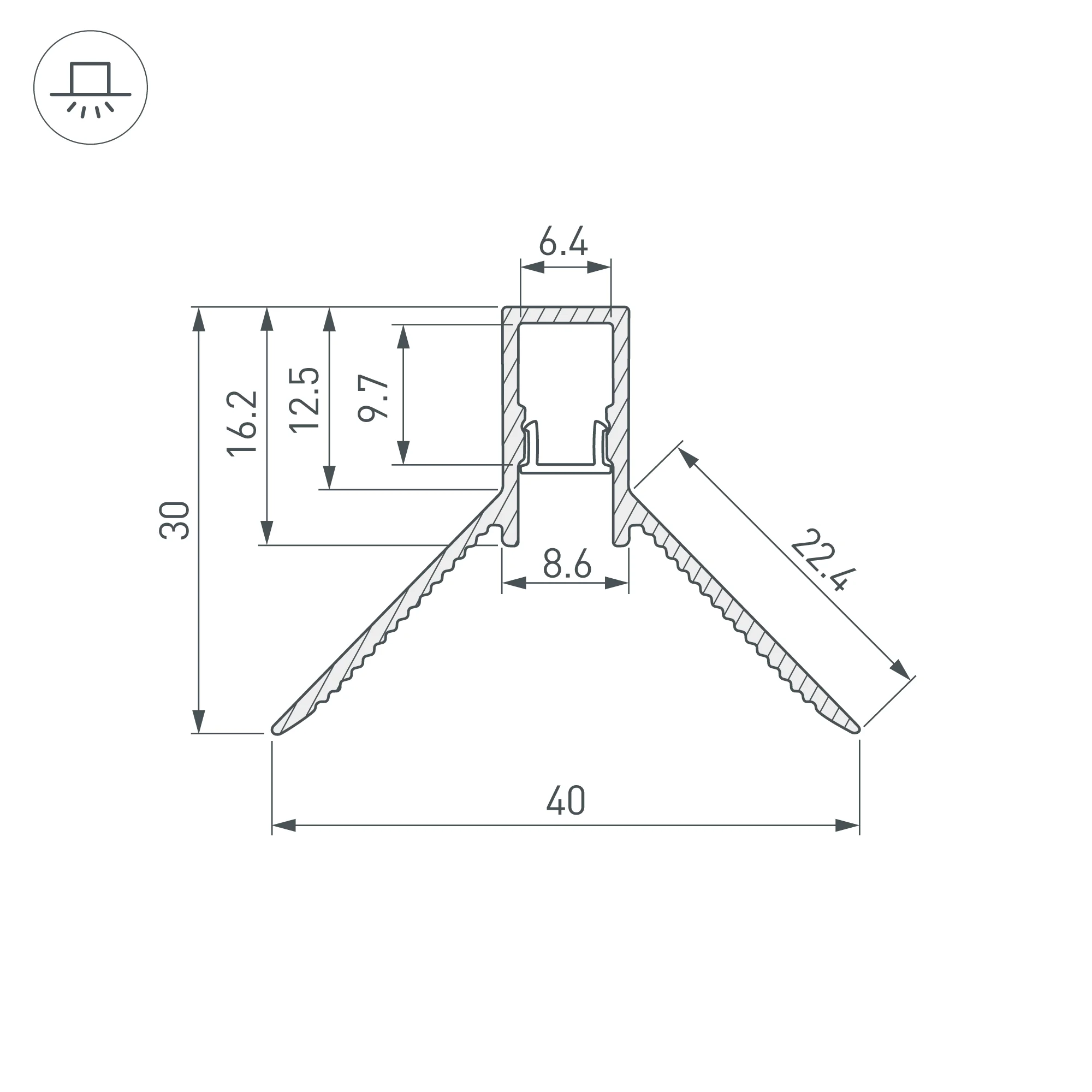 Алюминиевый анодированный угловой профиль для светодиодных лент и линеек, под строительную отделку. Фиксируется при помощи строительной смеси. Декоративная контурная подсветка внутренних углов стен и конструкций. Габаритные размеры (L×W×H): 2000x40x30 мм. Ширина площадки для ленты 6,4 мм. Экраны, заглушки и другие аксессуары приобретаются отдельно. Цена за 1 метр. Кратность заказа поставщику: 2 м.