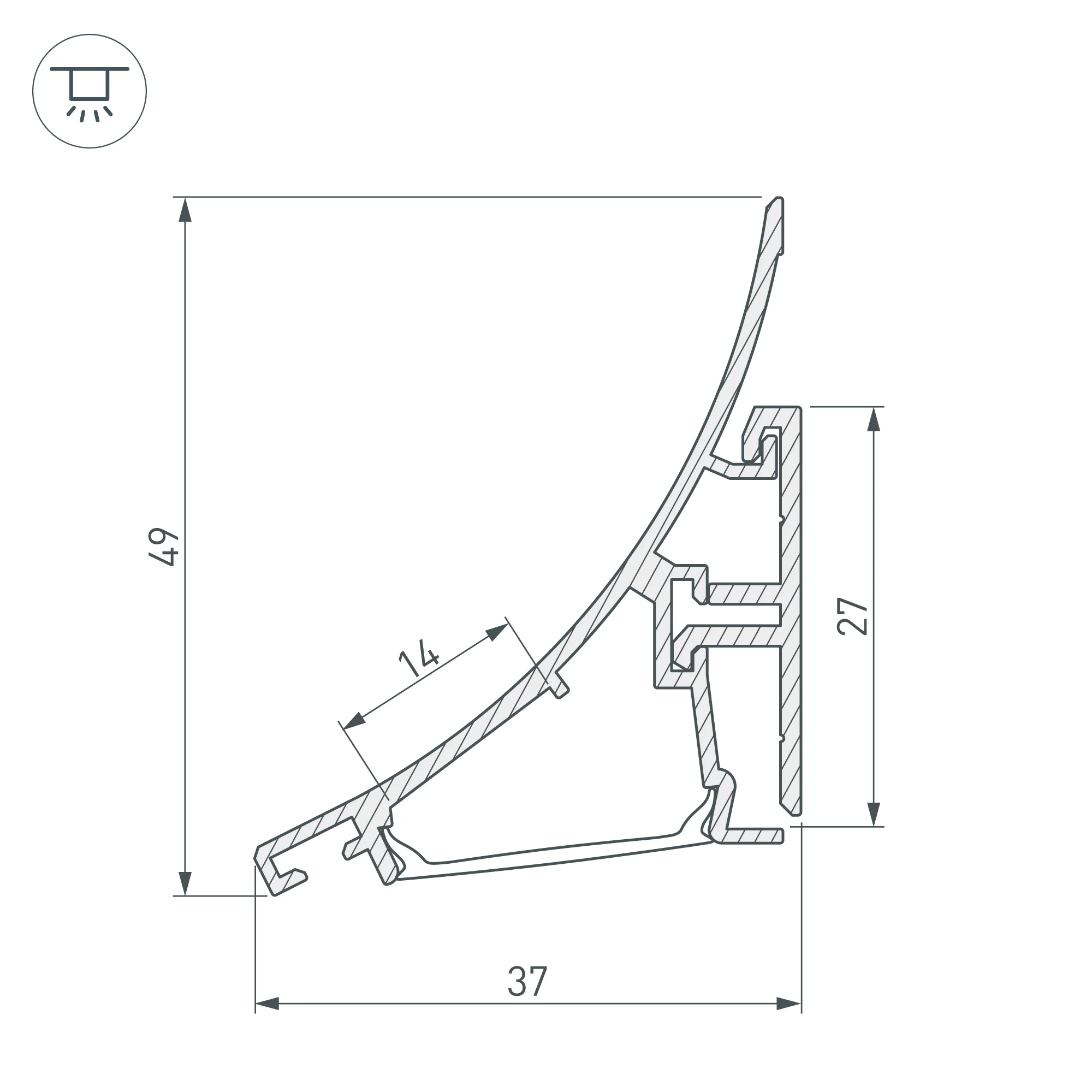 Алюминиевый анодированный профиль для подсветки стен и потолков. Состоит из двух частей — основания и профиля для светодиодной ленты. Габаритные размеры (L×W×H): 2000x49x37 мм. Ширина площадки для ленты 14 мм. Экраны, заглушки и другие аксессуары приобретаются отдельно. Скобы для соединения двух частей профиля идут в комплекте (3 шт на 2 м.). Цена за 1 метр. […]