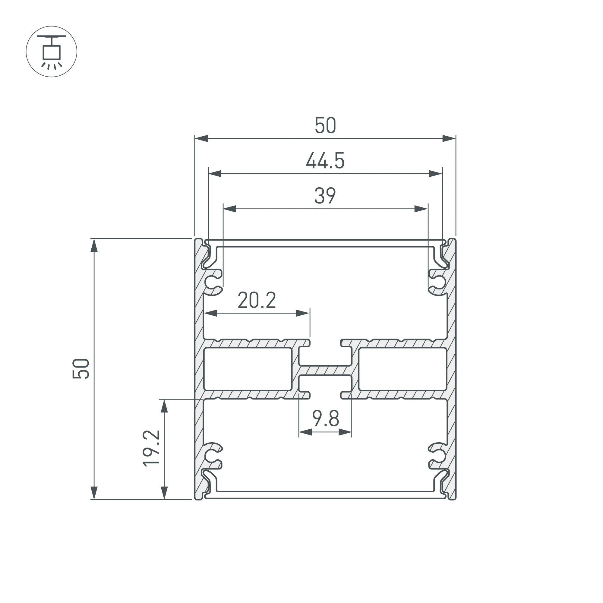 Алюминиевый анодированный профиль для светодиодных лент и линеек, свечение вверх и вниз. Габаритные размеры (L×W×H): 2000x50x50 мм. Ширина площадок для ленты 46,8 мм. Экраны, заглушки и другие аксессуары приобретаются отдельно. Цена за 1 метр. Кратность заказа поставщику: 2 м.