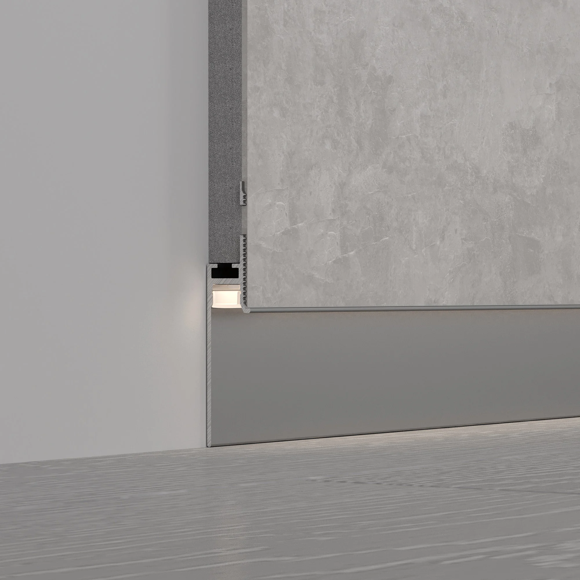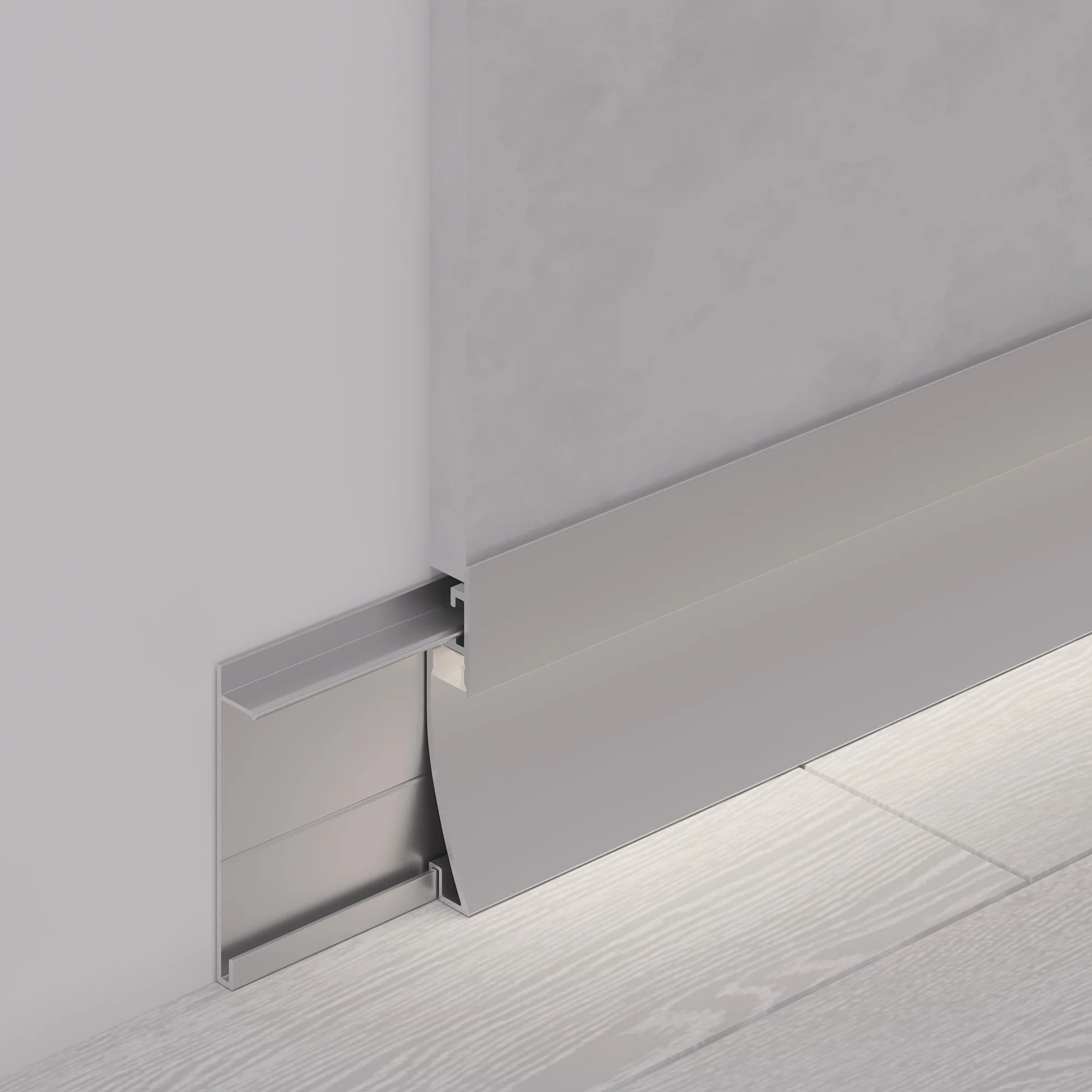 Алюминиевый анодированный встраиваемый двухкомпонентный профиль-плинтус для светодиодных лент и линеек. Габаритные размеры (L×W×H): 2000×12,20×58,30 мм. Ширина площадки для ленты 8 мм. Аксессуары приобретаются отдельно. Цена за метр. Кратность заказа поставщику: 2 м.