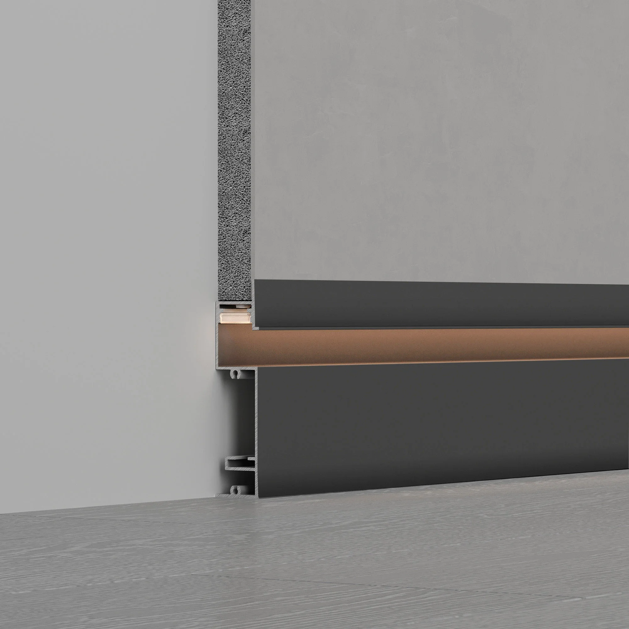 Алюминиевый профиль-плинтус для светодиодных лент и линеек. Цвет — черный RAL9005 (порошковая окраска). Габаритные размеры (L×W×H): 2000×17,6×72,1 мм. Ширина площадки для ленты 12 мм. Аксессуары приобретаются отдельно. Цена за метр. Кратность заказа поставщику: 2 м.