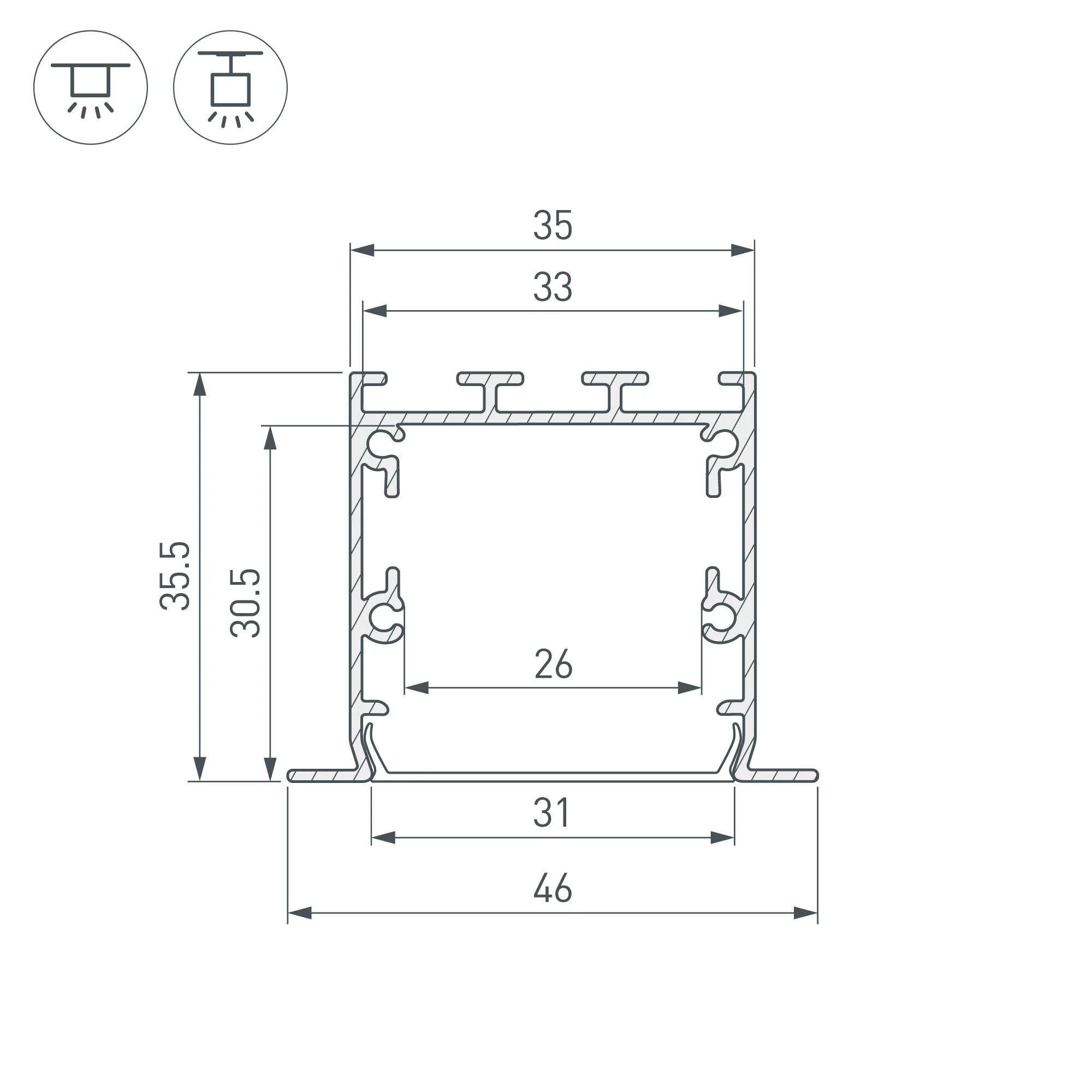 Алюминиевый анодированный профиль для светодиодных лент и линеек. Габаритные размеры (L×W×H): 3000x46x35,5 мм. Ширина площадки для ленты 26 мм. Экраны, заглушки и другие аксессуары приобретаются отдельно. Цена за 1 метр. Кратность заказа поставщику: 3 м.