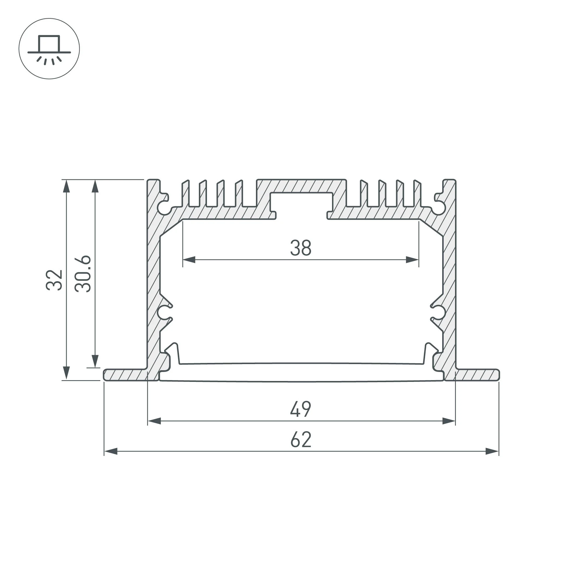 Алюминиевый анодированный профиль для светодиодных лент и линеек. Габаритные размеры (L×W×H): 3000x62x32 мм, паз для установки 49 мм. Ширина площадки для ленты 38 мм. Экраны, заглушки и другие аксессуары приобретаются отдельно. Цена за 1 метр. Кратность заказа поставщику: 3 м.