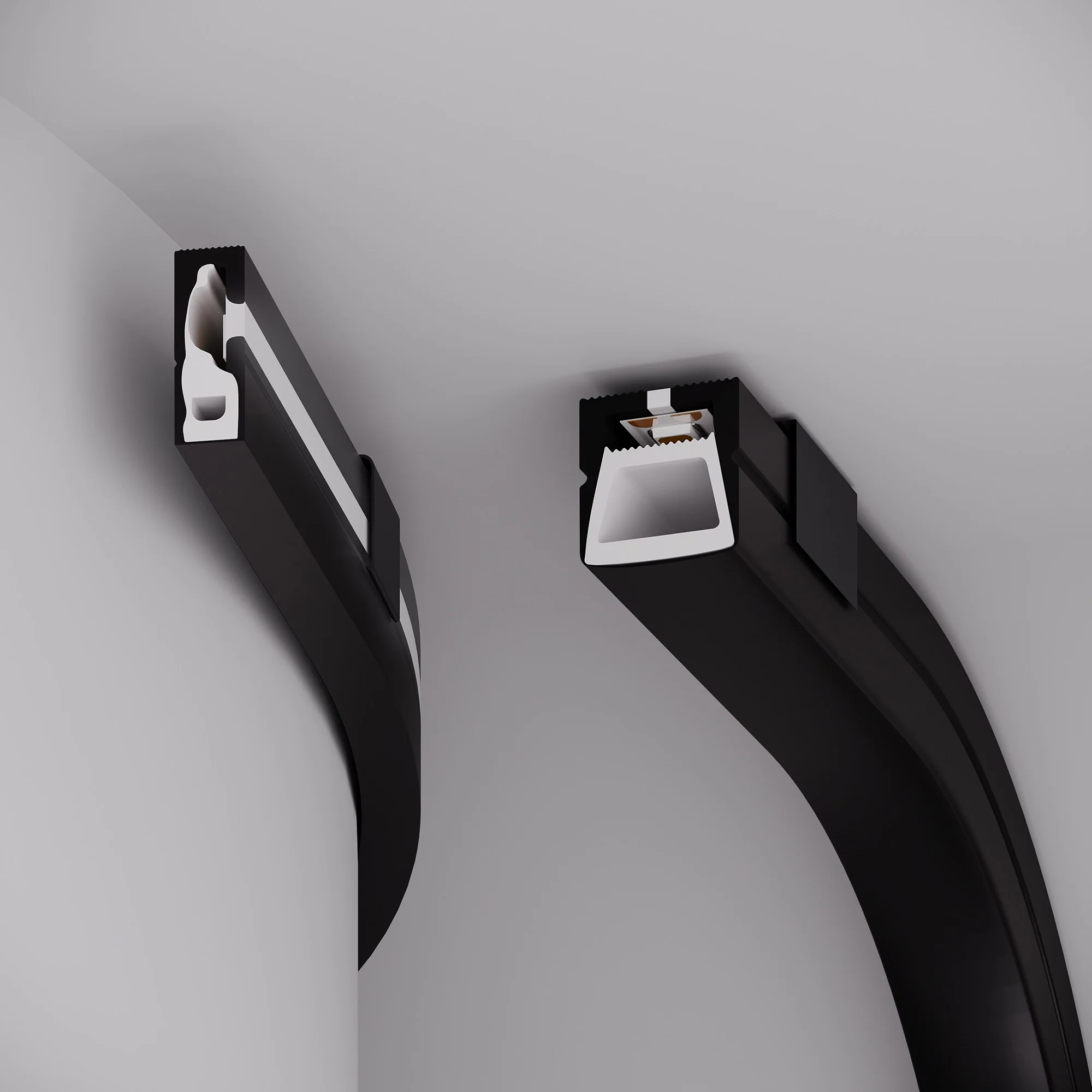 Цельнолитой силиконовый гибкий профиль, черный матовый. Габаритные размеры 5000×16×16 мм. Вертикальный изгиб TOP, минимальный радиус изгиба 60 мм. Для установки во влажных помещениях необходима герметизация при помощи двухкомпонентного эпоксидного герметика. Класс пылевлагозащиты – IP65 (при соблюдении технологии герметизации). Для лент шириной 10 мм, высотой до 2,85 мм и мощностью до 10 Вт/м. Угол излучения 110°. […]