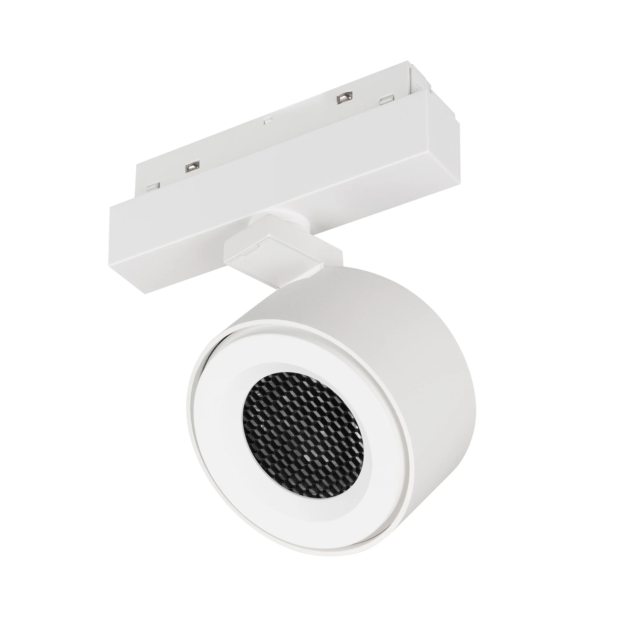 Светильник откидной для треков/шин 4 провода, 12Вт. Цвет свечения ДНЕВНОЙ 4000K, световой поток 770лм, CRI>90, угол свечения 24°, угол поворота 355°, угол наклона 90°. Корпус круглый, металл, цвет белый, IP40. Размер DxH Ø100×105мм. Питание AC 220-240V, 12Вт, драйвер встроенный (DC 300mA, 28-42V).