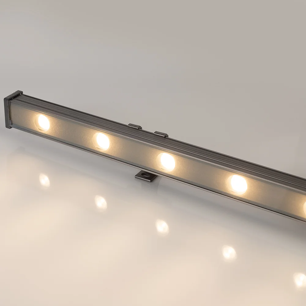 Линейный прожектор. Мощность 12 Вт, св. поток 1080 лм, 90 лм/Вт, теплый 3000 K, CRI>80, угол 30°, напряжение питания 230 В. Серый прямоугольный корпус из алюминия, экран стекло, степень защиты IP65. Размер: длина 1000 мм, ширина 40 мм, высота 30 мм. Монтаж на кронштейнах.