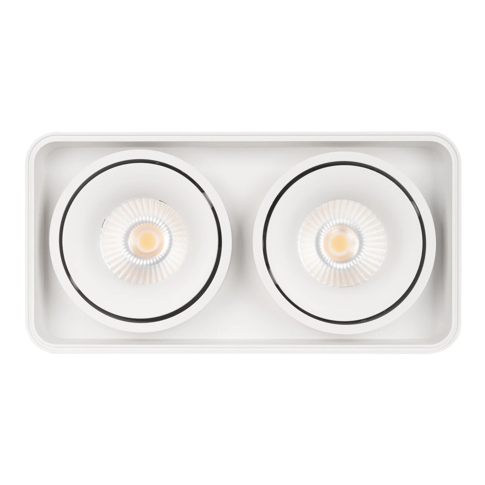 Накладной интерьерный светильник. Мощность 16 Вт, св. поток 1490 лм, 98 лм/Вт, дневной 4000 K, CRI>90, угол 45°, регулируемое направление луча 30°, напряжение питания 230 В. Белый прямоугольный корпус из алюминия, степень защиты IP20. Размер: длина 195 мм, ширина 100 мм, высота 100 мм. Монтаж накладной. Драйвер 26-40 В, 400 мА, пульсация <5%.