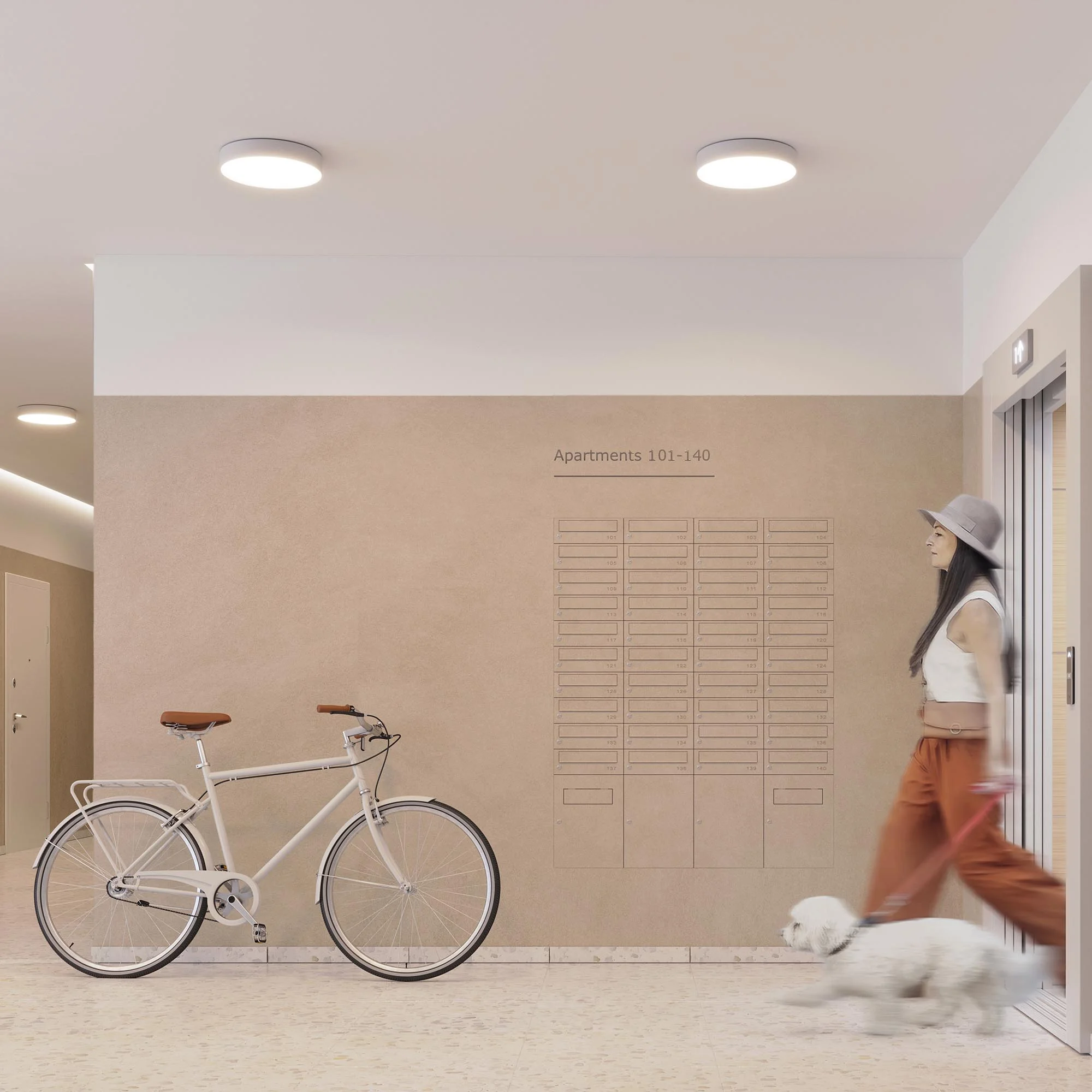 Накладной светильник 18Вт с микроволновым датчиком движения, белый круглый корпус (IK10). Цвет БЕЛЫЙ ТЕПЛЫЙ 3000К, св.поток 1790-1900лм, CRI(Ra)>80, угол 180°. Размер Ф300×50мм. Материал рассеивателя PMMA. Материал корпуса ABS пластик. Питание AC220-240V, 18Вт, драйвер встроенный (72V, 230mA).