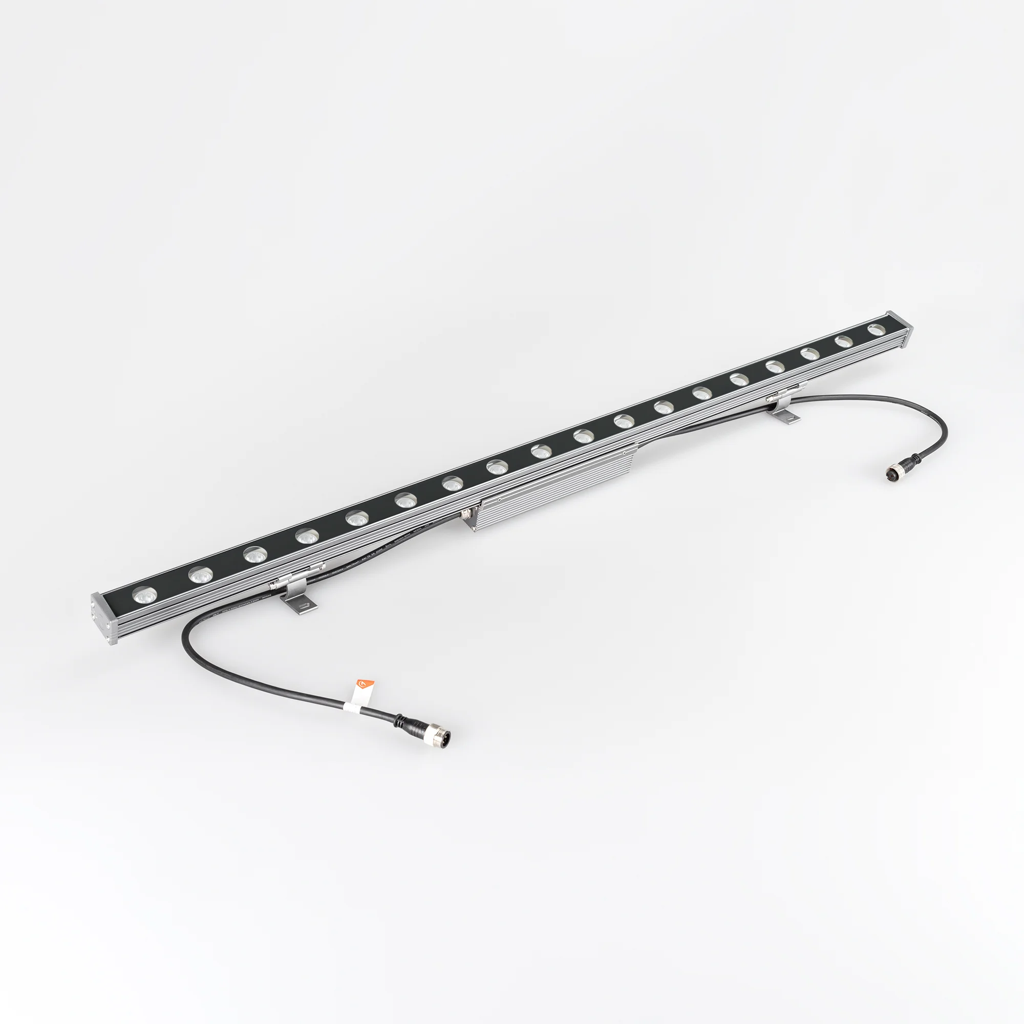 Ультратонкий линейный светодиодный прожектор. Мощность 18W, напряжение питания DC 24V. Светодиоды EPILED 18 штук. Цвет светодиодов RGB, управление по протоколу DMX512, угол рассеивания 30°. Корпус: алюминиевый сплав и армированное стекло. Цвет корпуса серый, степень влагозащиты IP65. Габариты 1000x40x30мм.