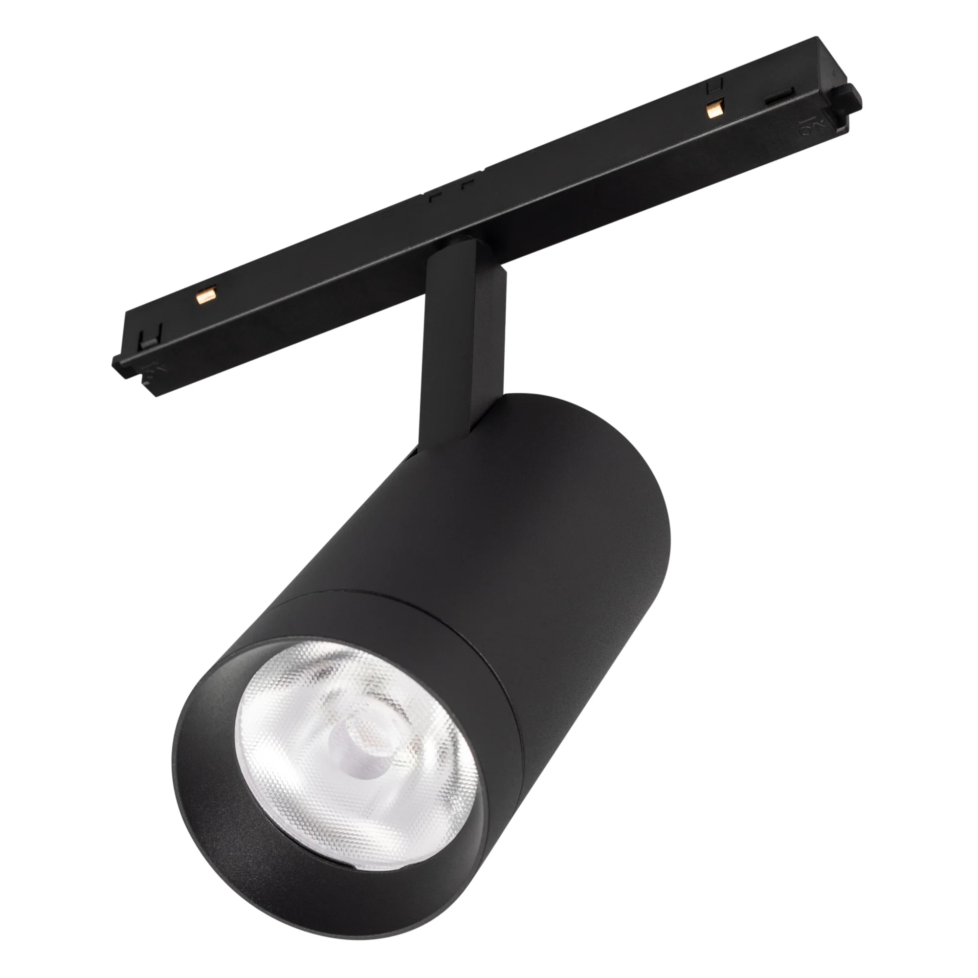 Светильник для магнитных треков MAG-ORIENT шириной 26 мм с управлением DALI. Мощность 20 Вт, св. поток 1840 лм, 92 лм/Вт, теплый 3000 K, CRI>90, угол 24°, напряжение питания 48 В. Черный фигурный корпус из металл, экран поликарбонат, степень защиты IP20. Размеры LxWxH 204x66x201 мм. Длина светоизлучающего модуля 140мм. Монтаж на трек MAG-ORIENT. Пульсация <1%.