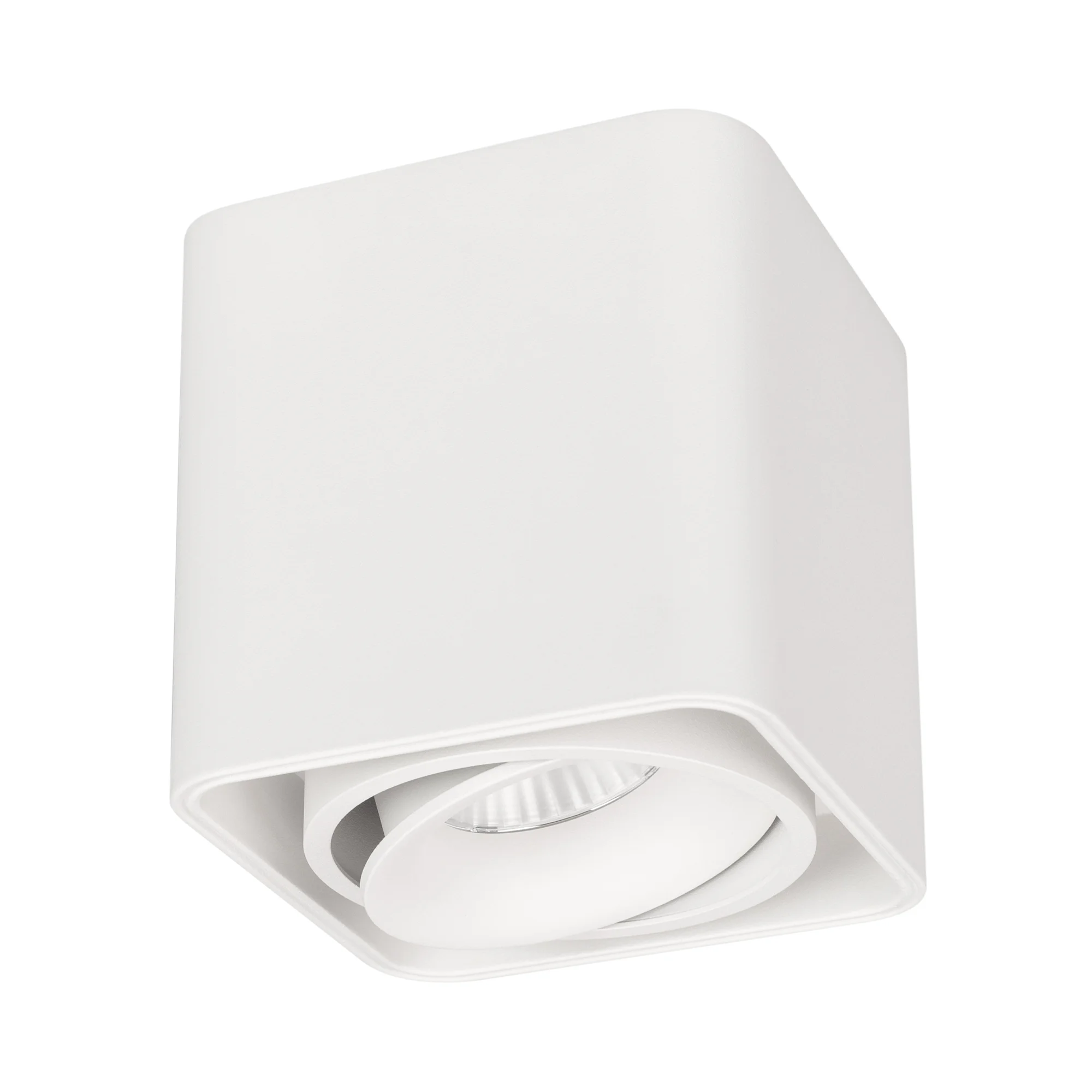Накладной интерьерный светильник. Мощность 8 Вт, св. поток 760 лм, 98 лм/Вт, теплый 3000 K, CRI>90, угол 45°, регулируемое направление луча 30°, напряжение питания 230 В. Белый квадратный корпус из алюминия, степень защиты IP20. Размер: длина 100 мм, ширина 100 мм, высота 100 мм. Монтаж накладной. Драйвер 24-42 В, 200 мА, пульсация <1%.