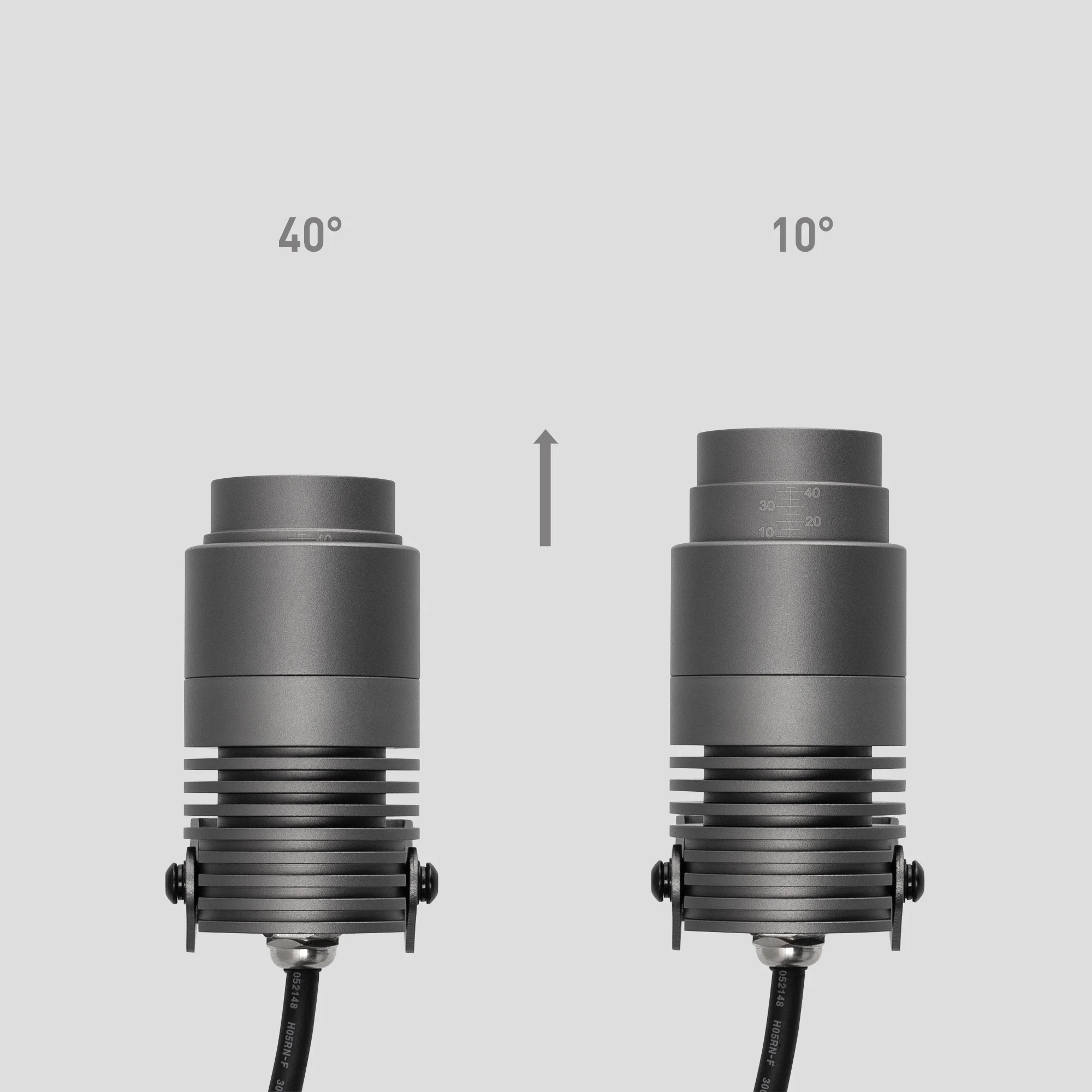 Уличный светодиодный прожектор, мощность 8Вт, регулируемый угол освещения 10-40°. Цвет ТЕПЛЫЙ 3000К, световой поток для угла 10° 240 для угла 40° 420лм. Влагозащищенный корпус IP67 — белый алюминий, экран из закаленного стекла. Угол поворота корпуса в вертикальной плоскости 135°. Питание 230В, мощность 8 Вт. Размеры DxH — Ø52×103мм. В комплекте 1м провод.