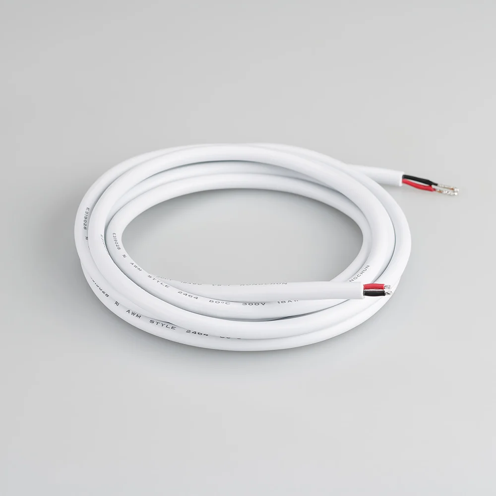 Провод питания для гибкого неона MOONLIGHT. 2 проводника, калибр проводника 20AWG, материал проводника — лужёная медь, внешний диаметр 4,5 мм. Внешняя оболочка — ПВХ белого цвета. Длина кабеля в отрезке — 2000 мм.