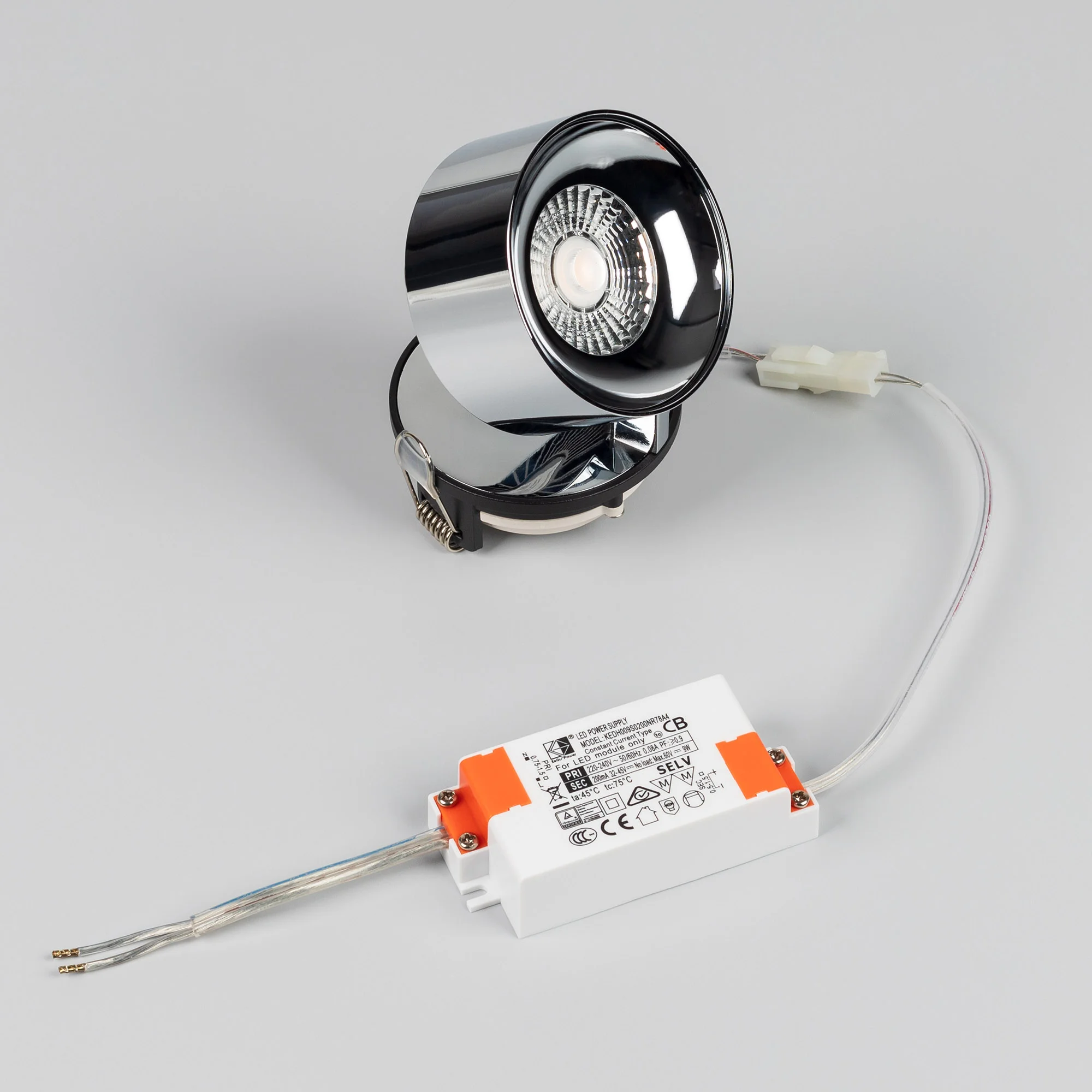Светильник накладной поворотный. Мощность 9 Вт, св. поток 580 лм, 64 лм/Вт, дневной 4000 K, CRI>90, угол 36°, напряжение питания 230 В. Модуль цвета хром, черный круглый корпус из алюминия, степень защиты IP20. Размеры корпуса: диаметр 77, высота 110 мм. Размер светодиодного модуля: диаметр 77 мм, высота 59 мм. Монтаж накладной. Драйвер 38 В, 200 […]