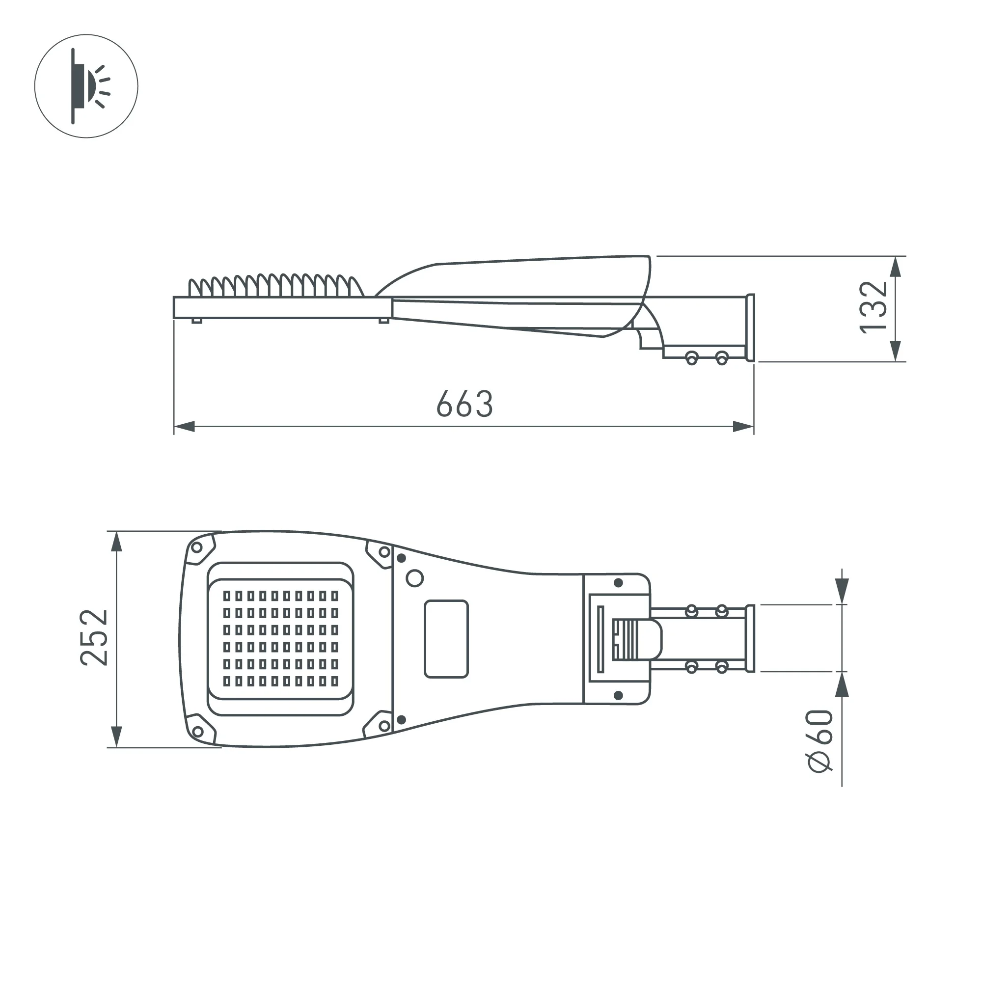 Светильник уличный консольный, цвет Day4000K, CRI>70, световой поток — 9600 лм. Габаритные размеры 663х252х132 мм. Тип КСС «Ш», угол рассеивания 150°х80°. Степень защиты IP66. Мощность 60 Вт, питание 230 В. Материал корпуса — литой алюминий, рассеиватель — темперированное стекло. Гарантия 3 года.