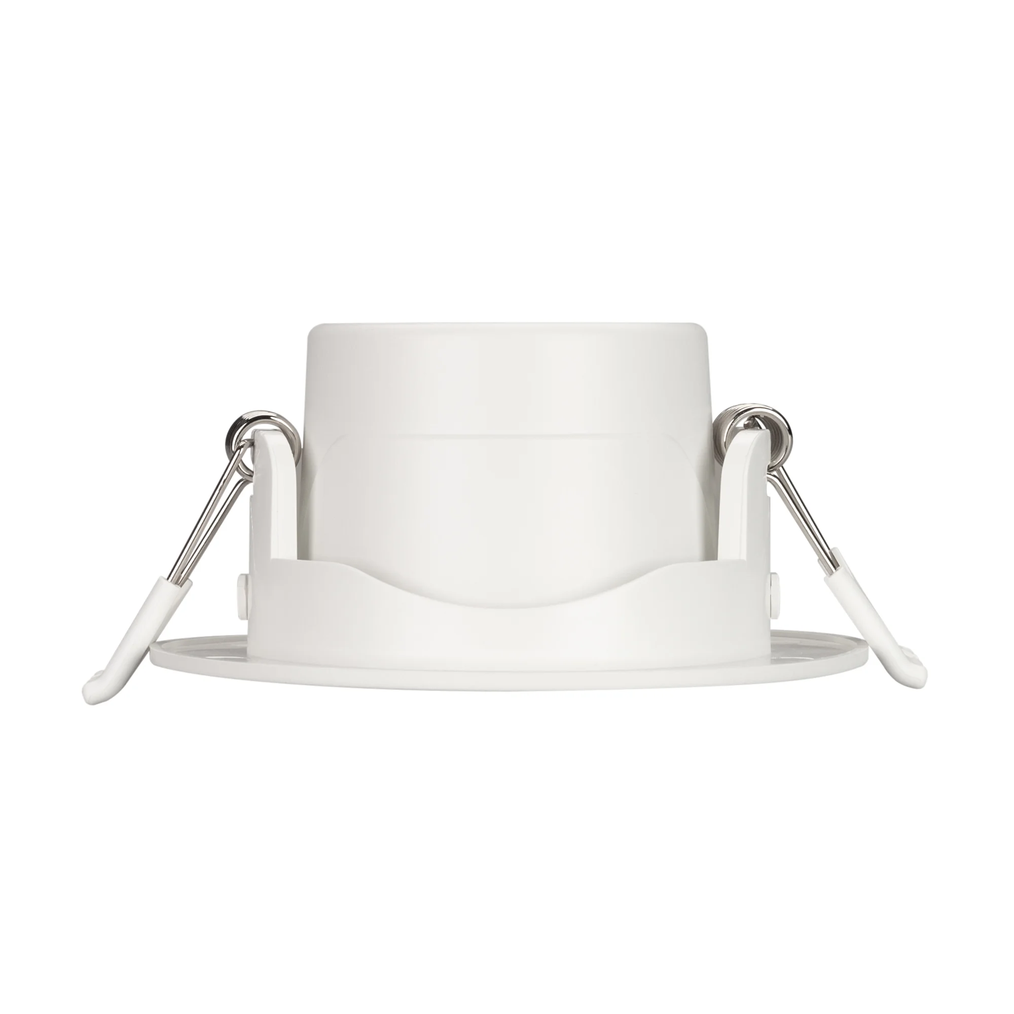 Встраиваемый поворотный светильник «даунлайт». Мощность 4.5 Вт, св. поток 400 лм, 89 лм/Вт, теплый 3000 K, CRI>80, UGR<19, угол 36°, напряжение питания 230 В. Белый круглый корпус из теплопроводящего полиамида, экран пластик, степень защиты IP20, угол поворота оси 30°. Размер: диаметр 80 мм, высота 37.5 мм. Монтаж встраиваемый, установочное отверстие диаметр 60-70 мм. Пульсация <2%.