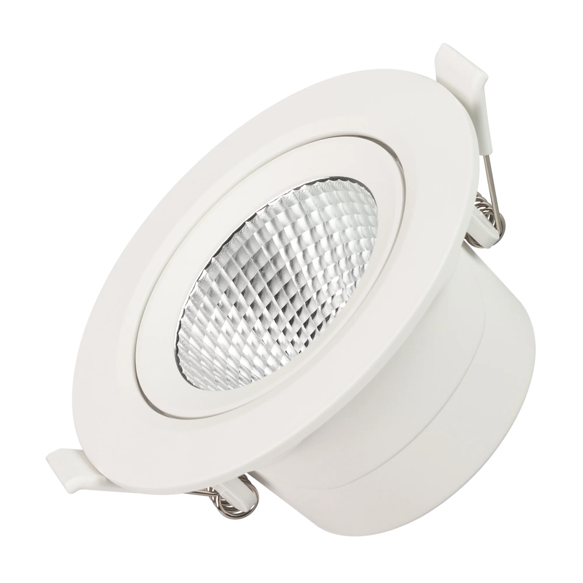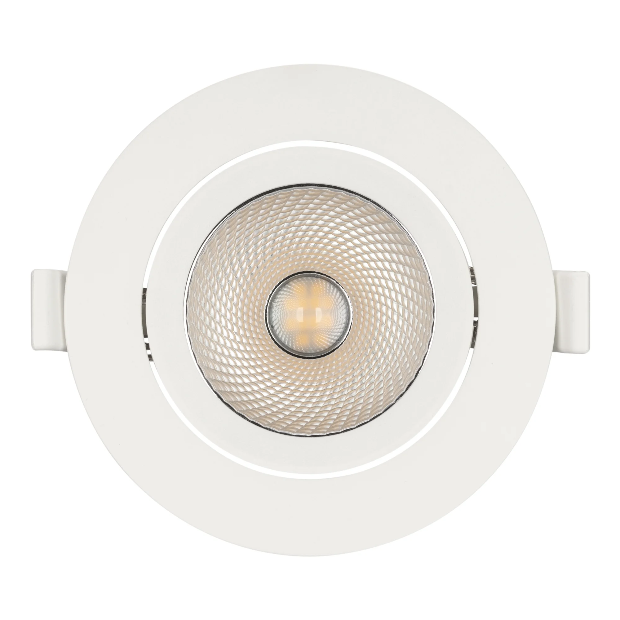 Встраиваемый поворотный светильник «даунлайт». Мощность 10 Вт, св. поток 900 лм, 90 лм/Вт, дневной 4000 K, CRI>80, UGR<19, угол 36°, напряжение питания 230 В. Белый круглый корпус из теплопроводящего полиамида, степень защиты IP20, угол поворота оси 30°. Размер: диаметр 105 мм, высота 51.5 мм. Монтаж встраиваемый, установочное отверстие диаметр 83-95 мм. Пульсация <2%.