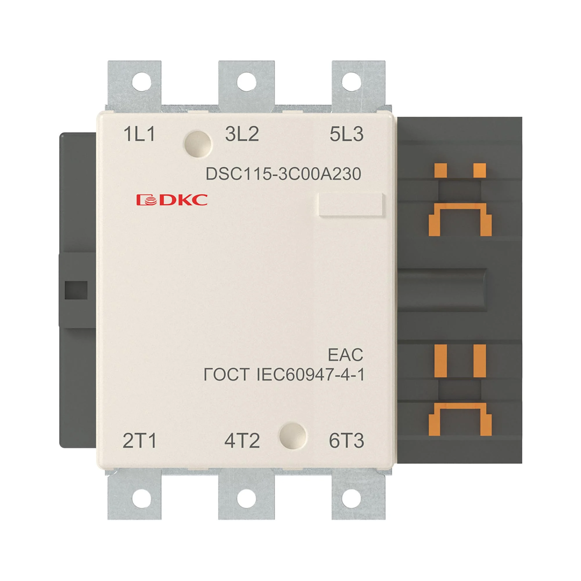 Электромагнитный контактор DSC115-3C00A230 115А 55 кВт (AC3) с катушкой 220 В AC для коммутации асинхронных двигателей, частотных приводов и других высокоиндуктивных нагрузок (категория применения АС-3), а также для работы в тяжелых режимах, таких как пуск и торможение противовключением электродвигателей с короткозамкнутым ротором (АС-4).