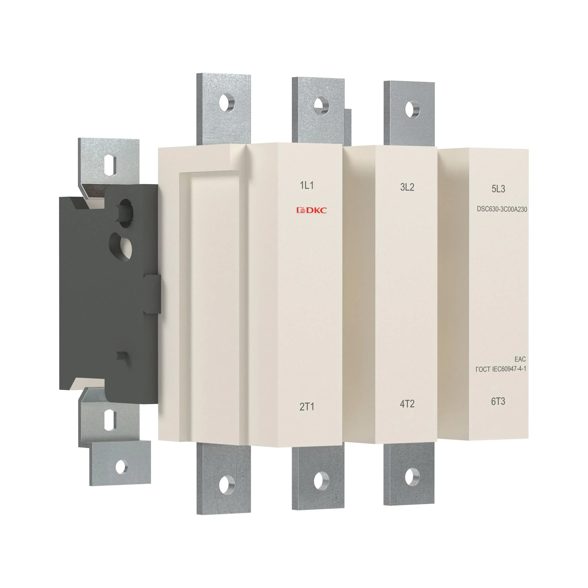 Электромагнитный контактор DSC630-3C00A230 630А 335 кВт (AC3) с катушкой 220 В AC для коммутации асинхронных двигателей, частотных приводов и других высокоиндуктивных нагрузок (категория применения АС-3), а также для работы в тяжелых режимах, таких как пуск и торможение противовключением электродвигателей с короткозамкнутым ротором (АС-4).