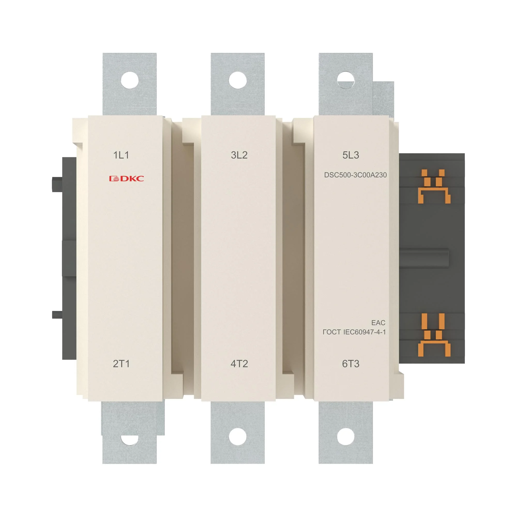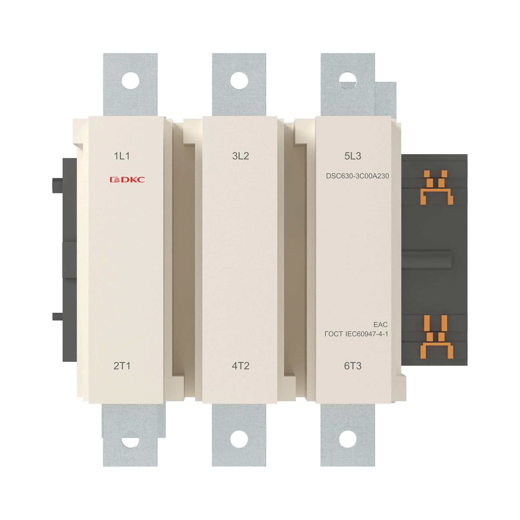 Электромагнитный контактор DSC630-3C00A380 630А 335 кВт (AC3) с катушкой 380 В AC для коммутации асинхронных двигателей, частотных приводов и других высокоиндуктивных нагрузок (категория применения АС-3), а также для работы в тяжелых режимах, таких как пуск и торможение противовключением электродвигателей с короткозамкнутым ротором (АС-4).