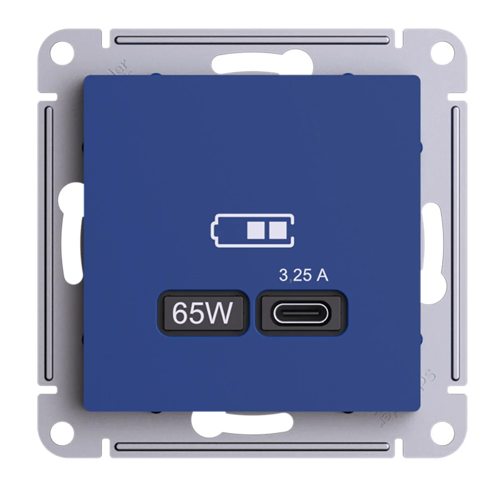 Розетка Systeme Electric (ранее Schneider Electric) серии AtlasDesign (цвет аквамарин) USB с разъемом типа C высокоскоростная Самая современная USB-зарядка позволяет заряжать ноутбук, а также смартфоны последнего поколения, которые поддерживают функцию быстрой зарядки. Мощность: тип-С — 65Вт. Поддерживает современные протоколы быстрой зарядки QC, PD, последних версий. Лицевые детали из качественного ABS-пластика, устойчивого к царапинам и УФ-излучению.