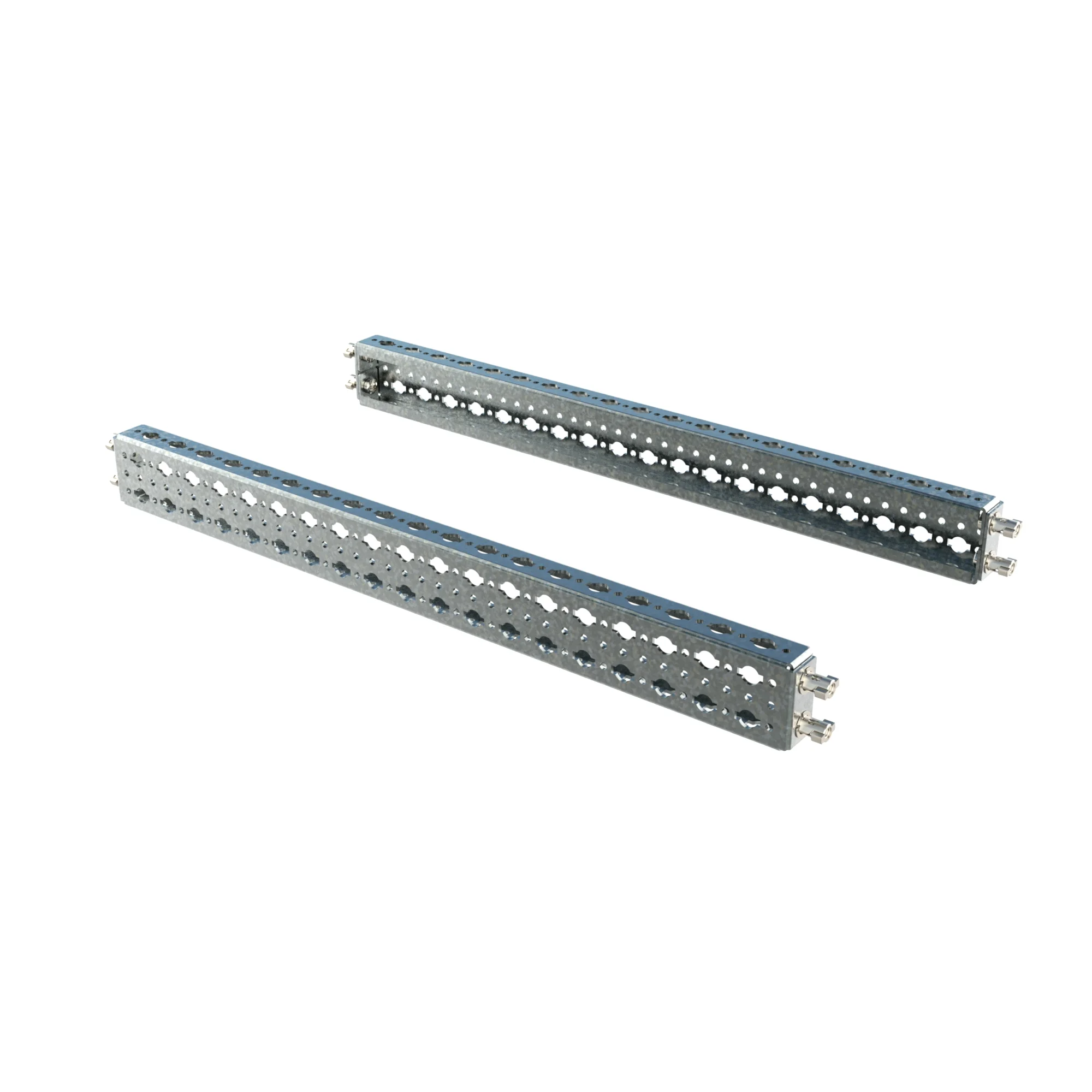 Рейки поперечные усиленные предназначены для организации тяжёлых шинных трасс и другого тяжёлого оборудования. Имеют две монтажные перфорированные плоскости. Монтаж осуществляется между рейками, установленными по глубине шкафа. Подходят для шкафа шириной 800 мм.
