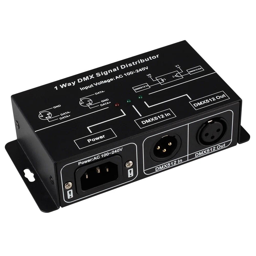 Сплиттер (усилитель) DMX512 сигнала. Вход — 1 порт DMX512, выход — 4 порта DMX512. Напряжение питания DC 12-36V, разъемы XLR3. Габариты 256х92х38 мм.
