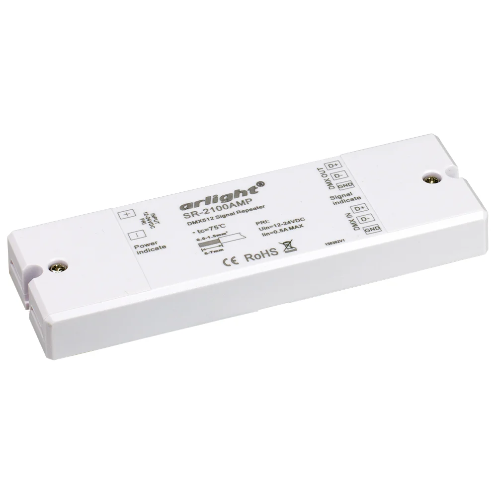 Усилитель сигнала DMX512. Вход — DMX512, выход 2CHxDMX512, напряжение питания DC 12-48V. Максимальный потребляемый ток 0.5А. Габариты 175х45х27 мм.