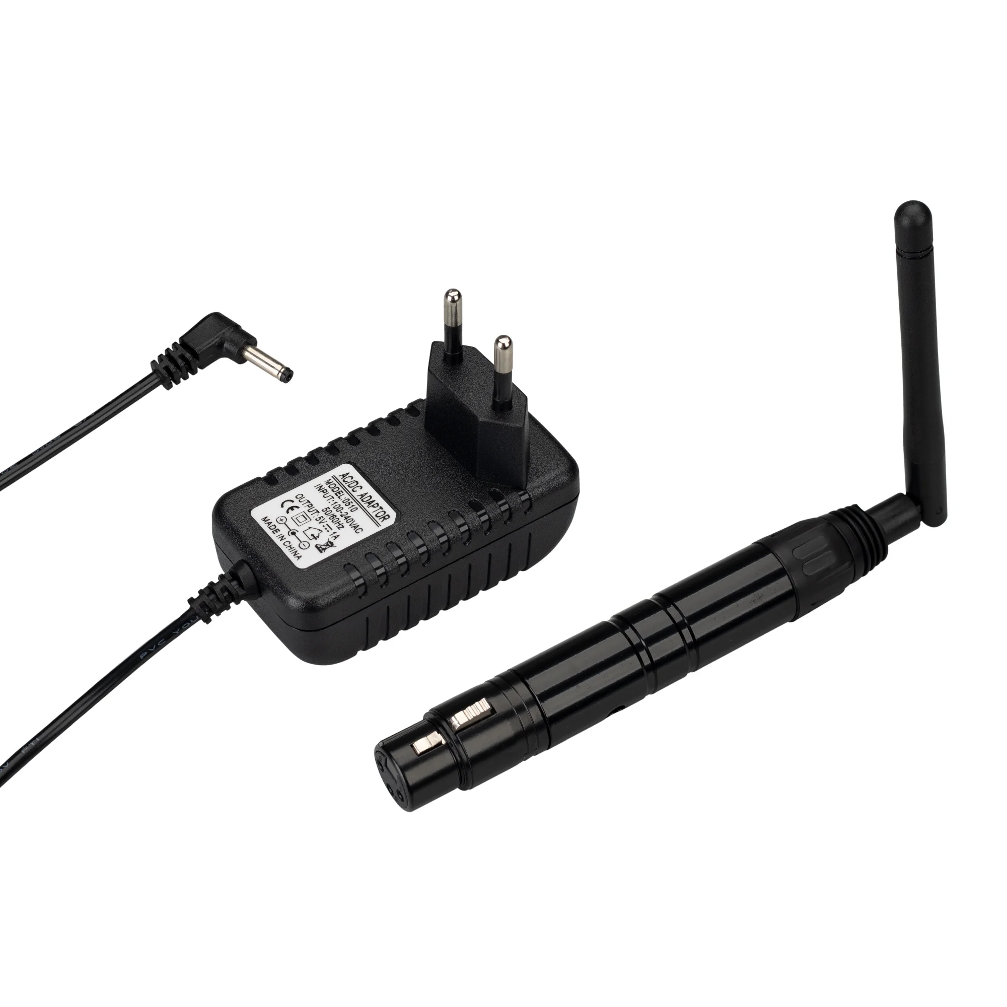 Беспроводной передатчик (усилитель) сигнала DMX512. Вход — сигнал DMX512, выход радиосигнал 2.4G. Разъем XLR3 Female, питание DC 5V (укомплектован адаптером). Максимальное расстояние между передатчиком и приёмником сигнала — 400 метров. Габариты 219x19x19 мм. Габариты адаптера с проводом 968x60x65 мм. Работает в паре с приемником сигнала 028417.