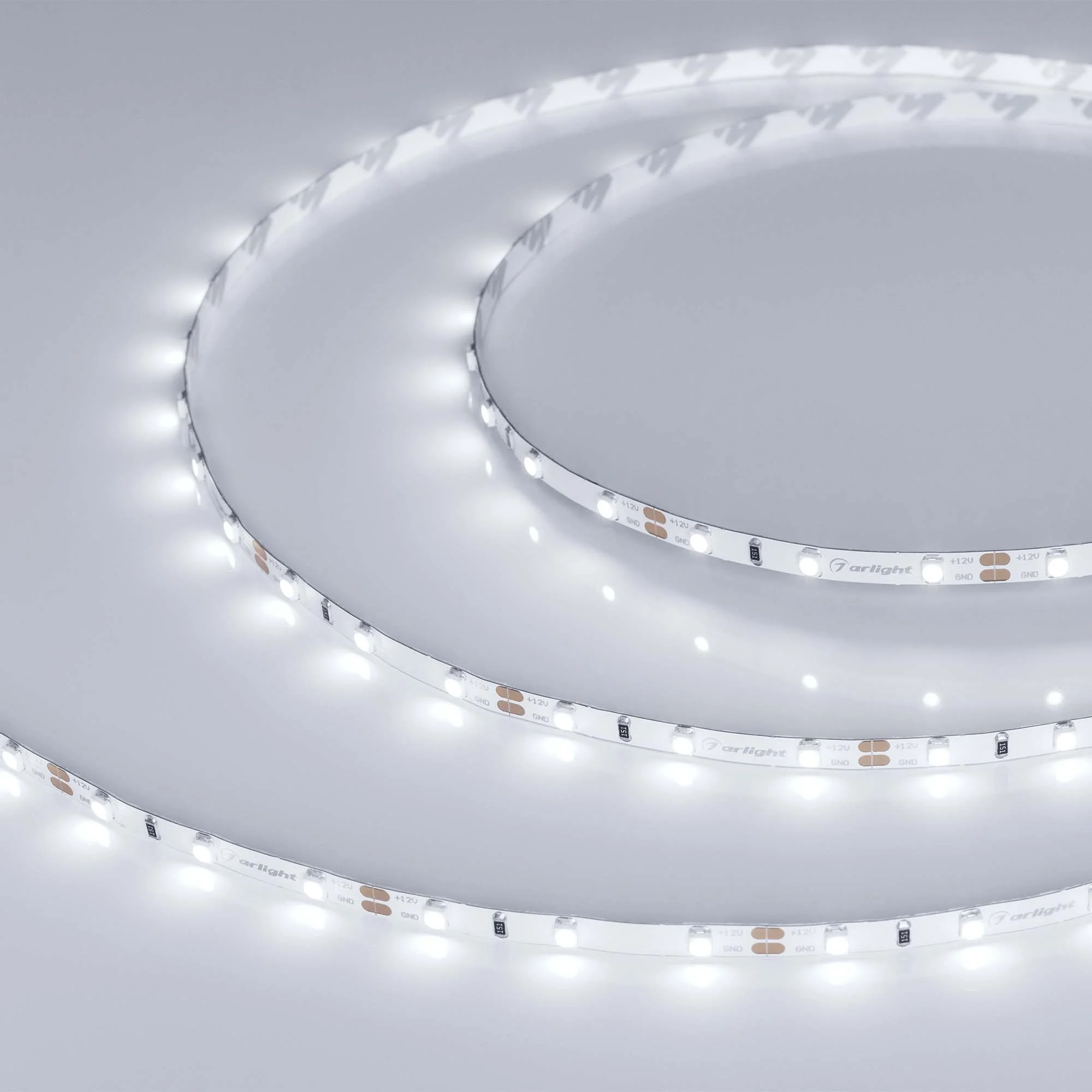 Светодиодная узкая лента RT серии A60. Светодиоды 2835, 60 шт/м, белая плата шириной 5 мм, скотч 3M. Цвет БЕЛЫЙ 6000K, индекс цветопередачи CRI>85, угол 120°. Питание 12 В, мощность 4.8 Вт/м (24 Вт на 5 м). Размеры 5000х5х1.5 мм. Мин. отрезок 50 мм, 3 светодиода. Цена за 1 м. Кратность заказа поставщику: 5 м.