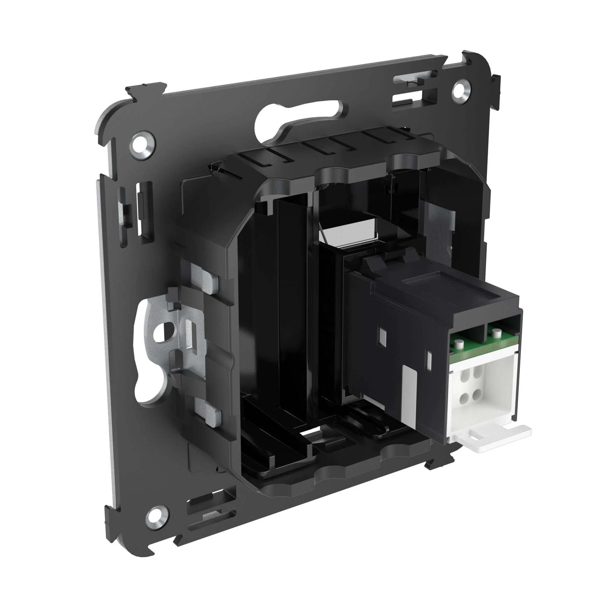 Компьютерная розетка RJ-45 в стену, двойная. Категория: 5e. Предназначена для монтажа в подрозеточные коробки глубиной не менее 45 мм (код 59301); подключение сетевого кабеля к рабочему месту. Характеристики: 8P8C; пылезащитной шторкой; с маркировочной табличкой; возможность заделки без инструмента. Цвет: «Черный матовый».