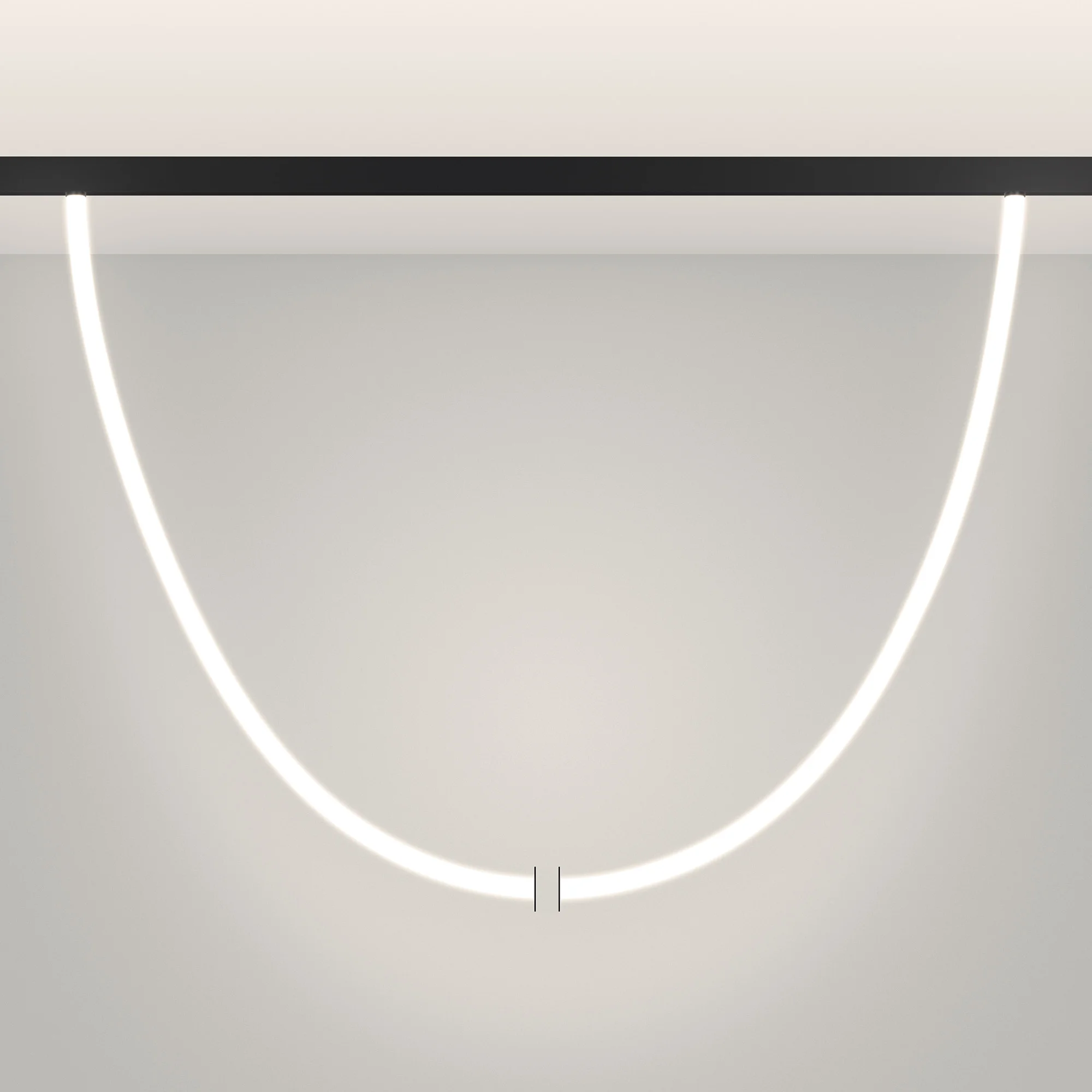 Светильник гибкий для магнитных треков серии ORIENT. Мощность 35 Вт, св. поток 2120 лм, 60 лм/Вт, теплый 3000 K, CRI>90, угол 360°, напряжение питания 48 В. Матовый белый фигурный корпус из силикона с черными креплениями. Размер: диаметр 25 мм, длина 2500 мм. Монтаж на магнитный трек ORIENT. Адаптеры в комплекте.