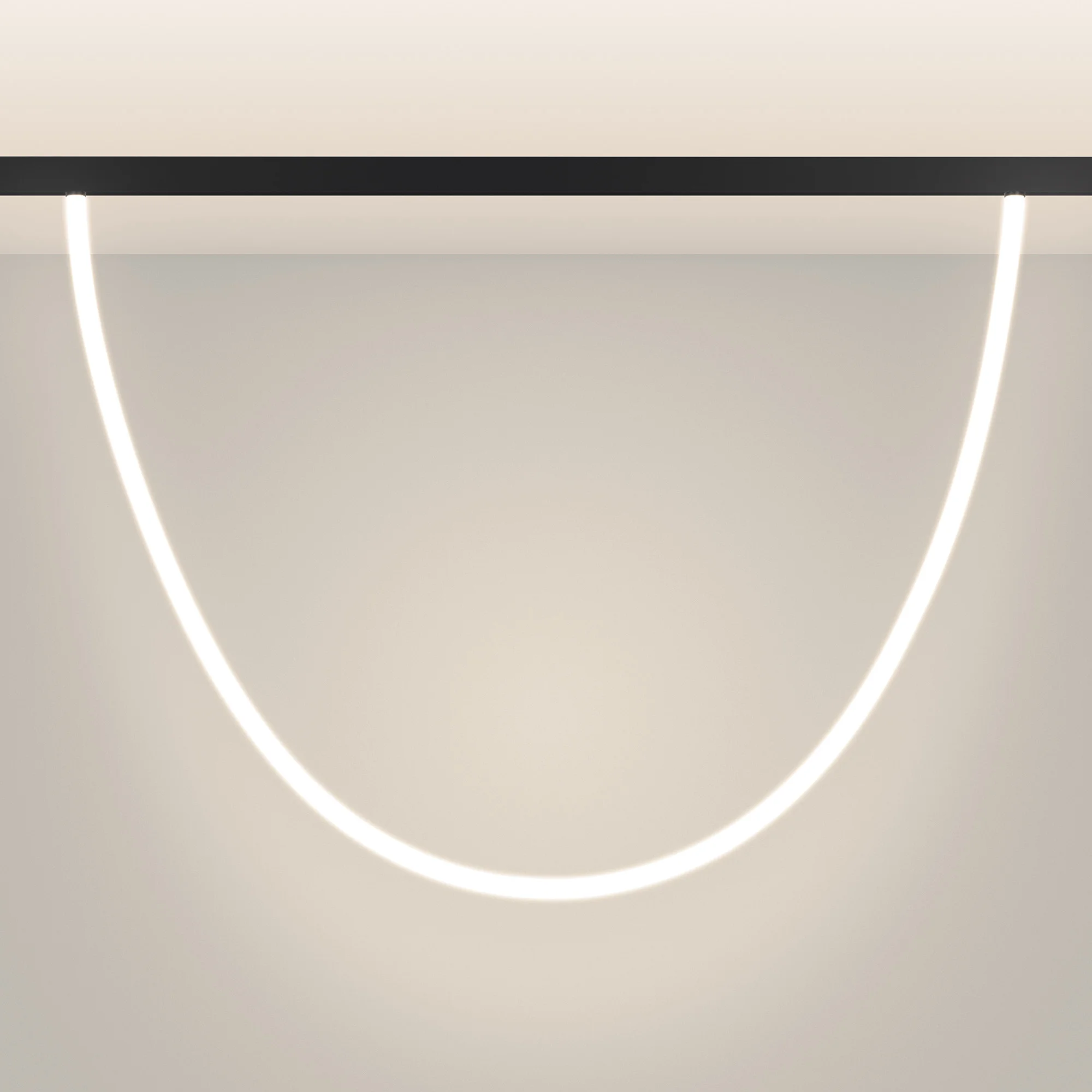 Светильник гибкий для магнитных треков серии ORIENT. Мощность 70 Вт, св. поток 4550 лм, 65 лм/Вт, дневной 4000 K, CRI>90, угол 360°, напряжение питания 48 В. Матовый белый фигурный корпус из силикона с черными креплениями. Размер: диаметр 25 мм, длина 5000 мм. Монтаж на магнитный трек ORIENT. Адаптеры входят в комплект.