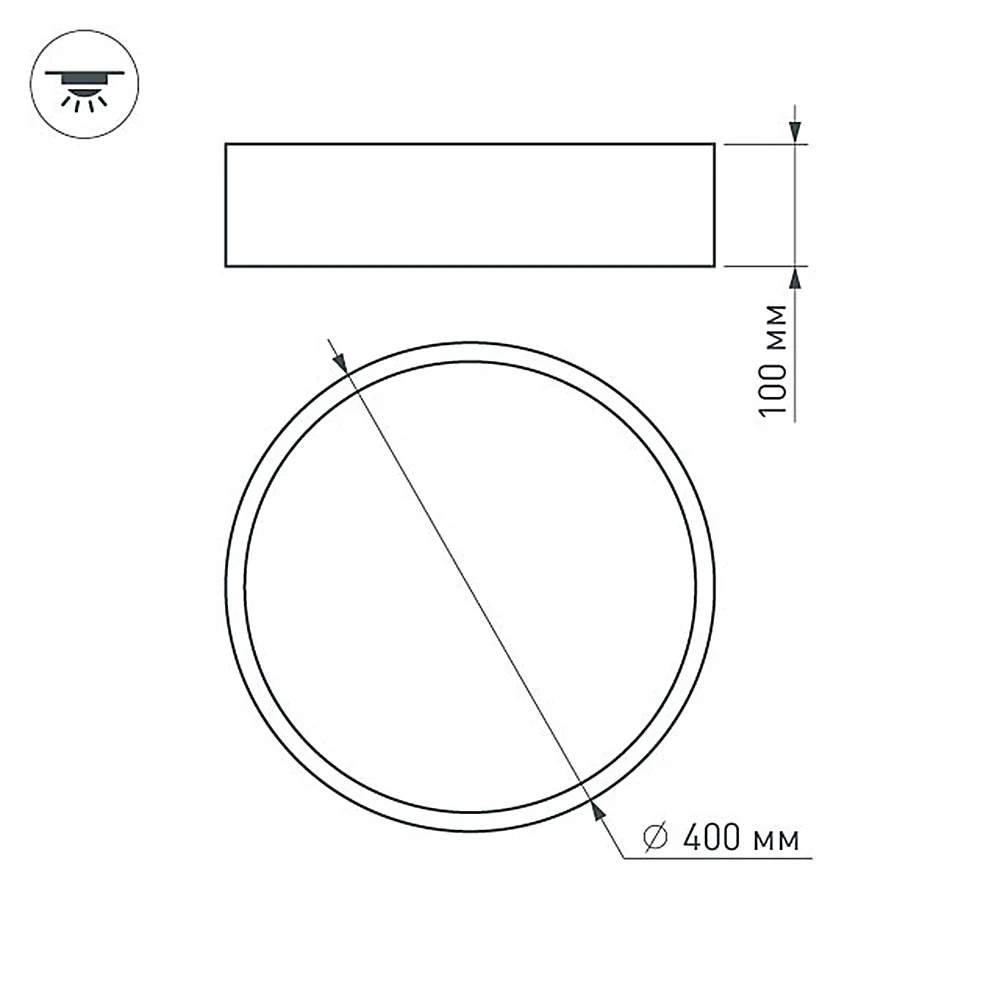 Накладной интерьерный светильник. Мощность 25 Вт, св. поток 2025 лм, 80 лм/Вт, дневной 4000 K, CRI>80, угол 100°, напряжение питания 230 В. Черный круглый корпус из алюминия, степень защиты IP20. Призматический акриловый рассеиватель. Размер: диаметр 400 мм, высота 100 мм. Монтаж накладной. Драйвер 30-42 В, 750 мА, пульсация <2%.