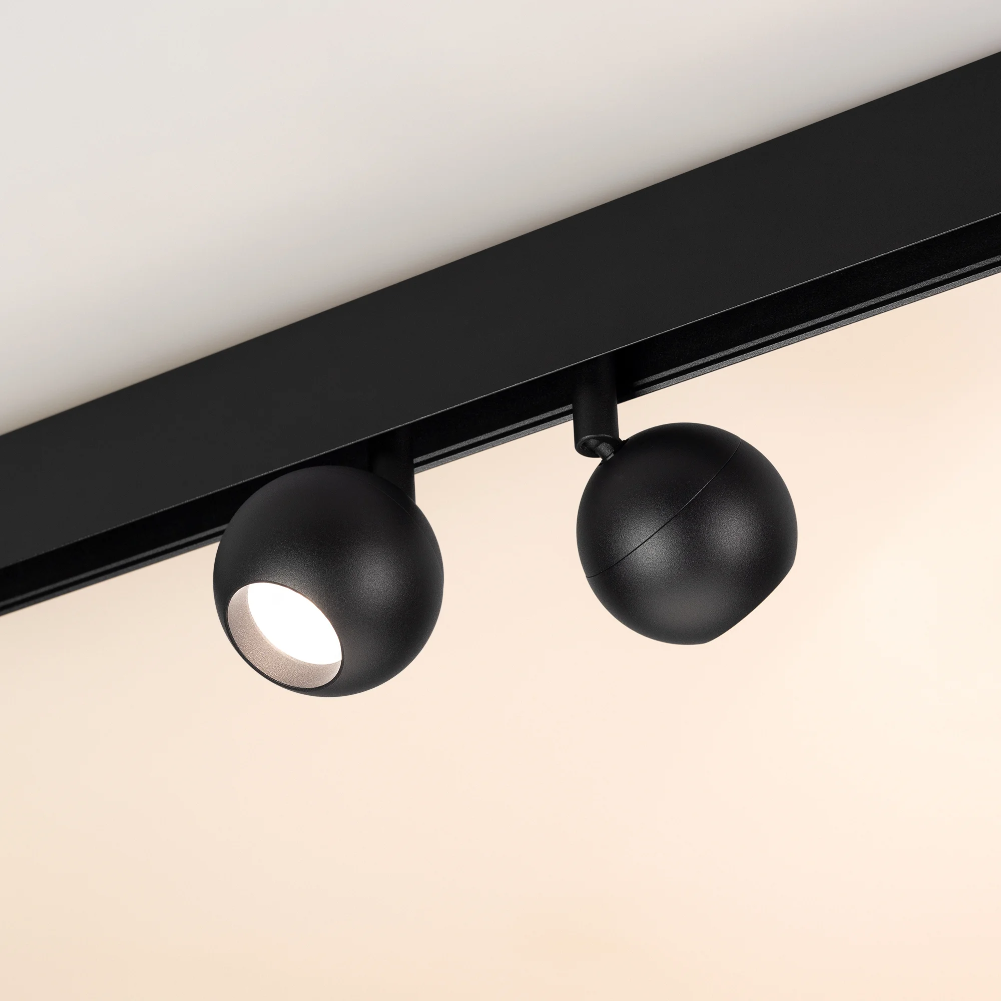 Светильник для магнитных треков MAG-ORIENT шириной 26 мм. Мощность 10 Вт, св. поток 800 лм, 80 лм/Вт, теплый 3000 K, CRI>90, угол 35°, напряжение питания 48 В. Черный круглый корпус из металл, степень защиты IP20. Размер светоизлучающего модуля: 65*59 мм. Монтаж на трек MAG-ORIENT. Пульсация <1%.