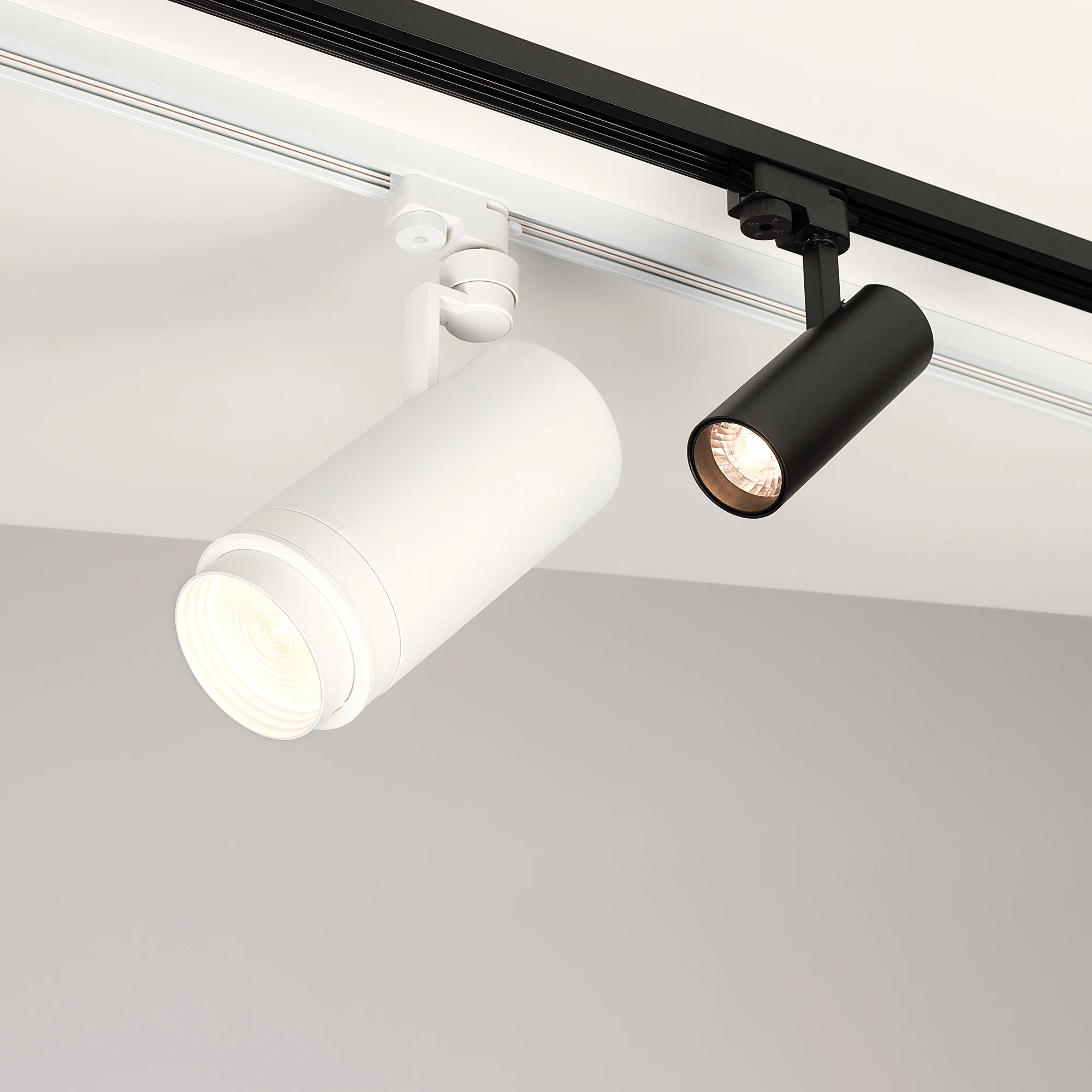 Светильник для треков/шин 2 провода. Мощность 30 Вт, св. поток 2700-3300 лм, 90 лм/Вт, теплый 3000 K, CRI>90, угол 24°, напряжение питания 230 В. Черный круглый корпус из алюминия, материал линзы PMMA , степень защиты IP20. Размер: диаметр 90 мм, высота 185 мм. Монтаж на трек 1-фазный. Драйвер встроенный 30-40 В, 750 мА., пульсация <1%.