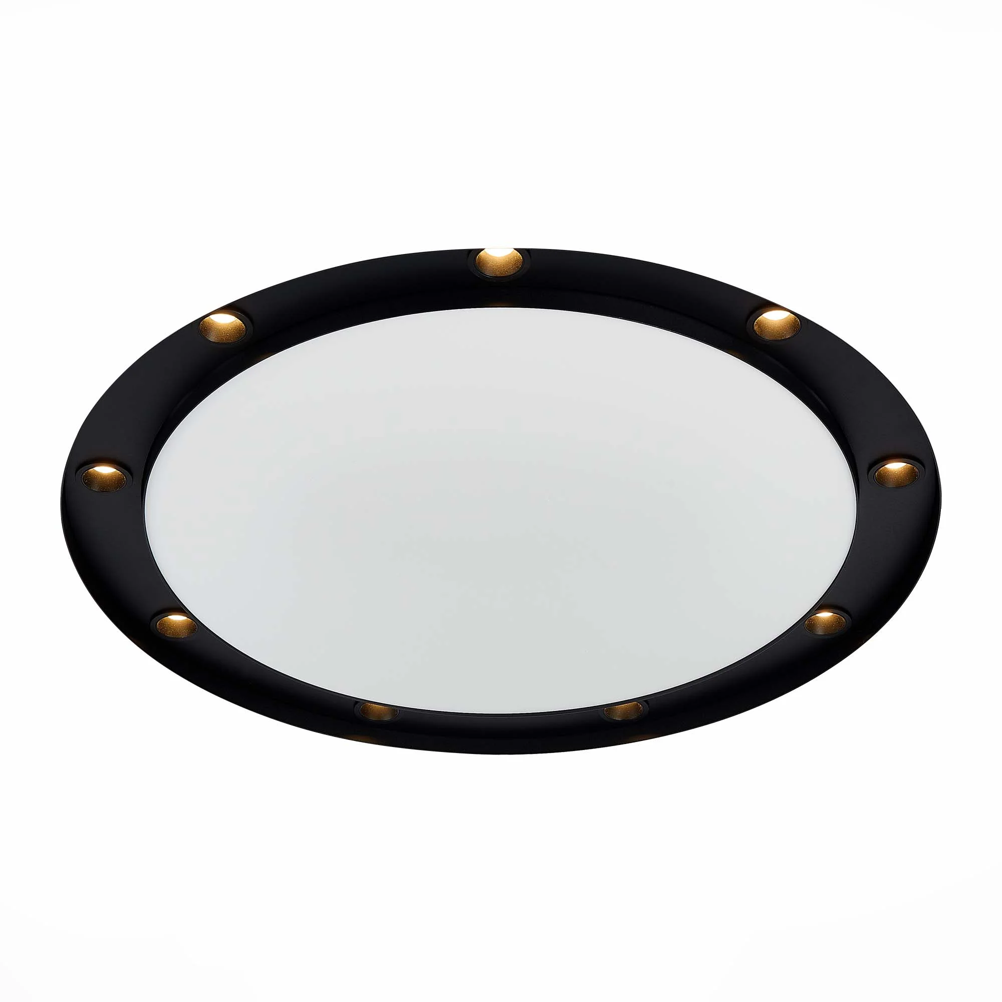 Накладной интерьерный светильник. Мощность 50 Вт, св. поток 4050 лм, 80 лм/Вт, теплый 3000 K, CRI>80, угол 100°, напряжение питания 230 В. Черный круглый корпус из алюминия, степень защиты IP20. Призматический акриловый рассеиватель. Размер: диаметр 600 мм, высота 100 мм. Монтаж накладной. Драйвер 28-42 В, 1200 мА, пульсация <5%.