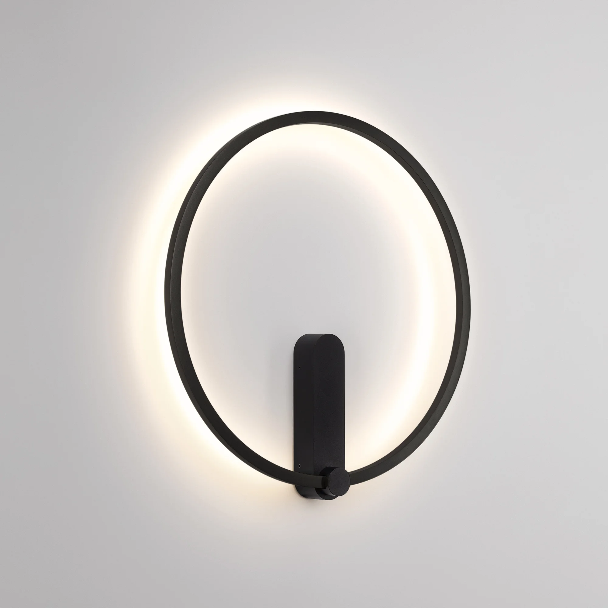 Декоративный настенный светильник. Мощность 13 Вт, св. поток 850 лм, 65 лм/Вт, дневной 4000K, CRI>80, угол 110°, напряжение питания 230 В. Черный фигурный корпус из алюминия, экран из поликарбоната, степень защиты IP20. Размер: диаметр 400 мм, размер основания: длина 178мм, ширина 43 мм. Монтаж накладной. Пульсация <0,5. Возможность поворота светоизлучателя на 355 градусов.