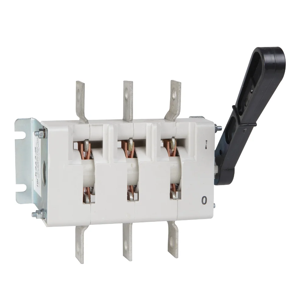 Выключатель-разъединитель 3 полюсный на номинальный ток 100 А, в котором установлена несъемная рукоятка.