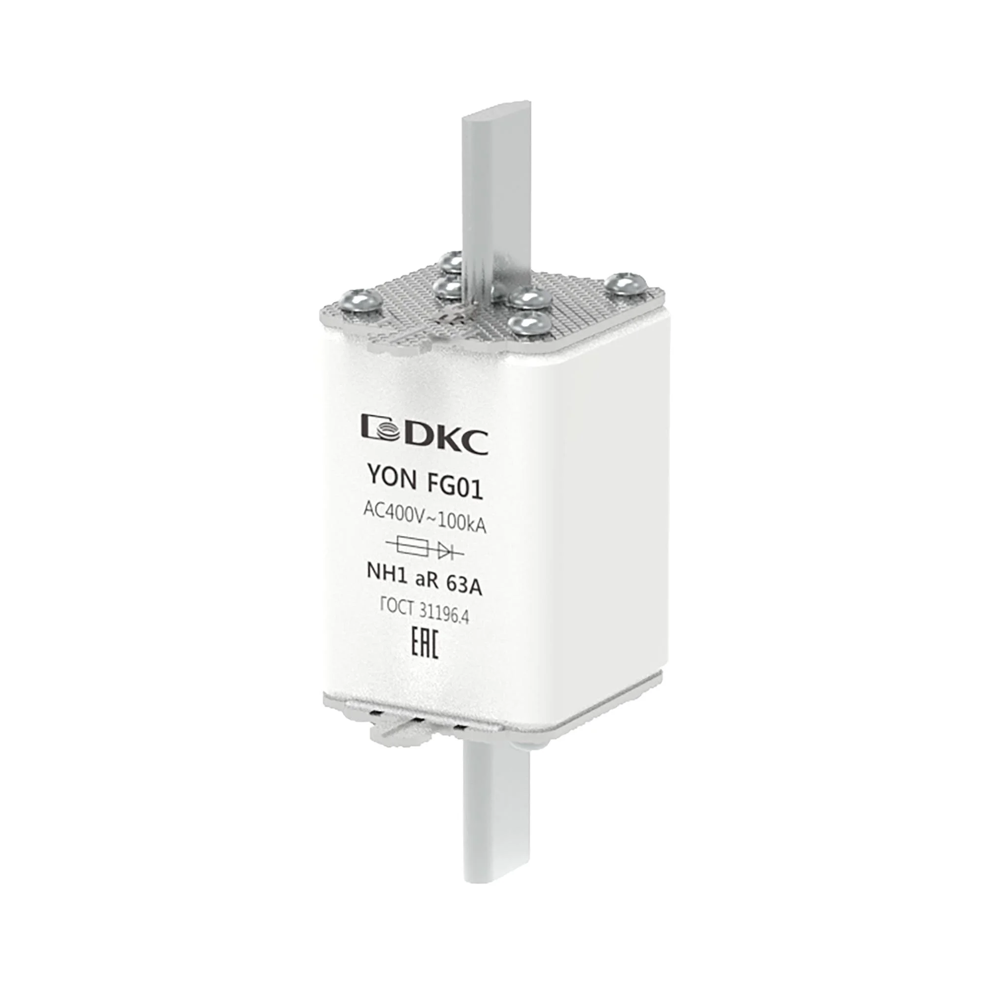 Предохранитель YON ножевого типа FG1 с одинарной индикацией 63А предназначен для защиты полупроводников и электронных компонентов электроустановки от короткого замыкания в цепях переменного тока напряжением до 400В (характеристика aR).