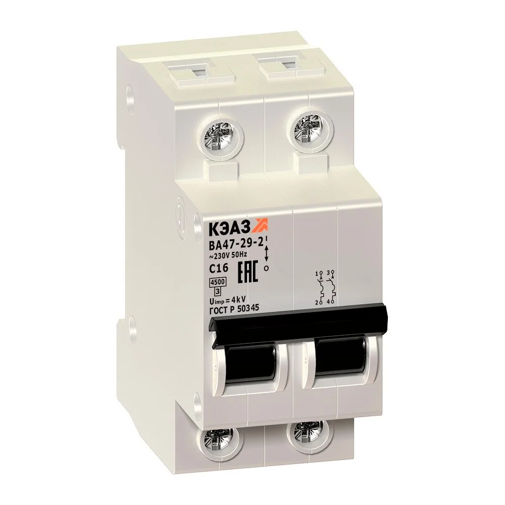 Модульный автоматический 2 полюсный выключатель переменного тока с предельной коммутационной способностью при переменном токе 4.5 кА на номинальный ток 16 А .