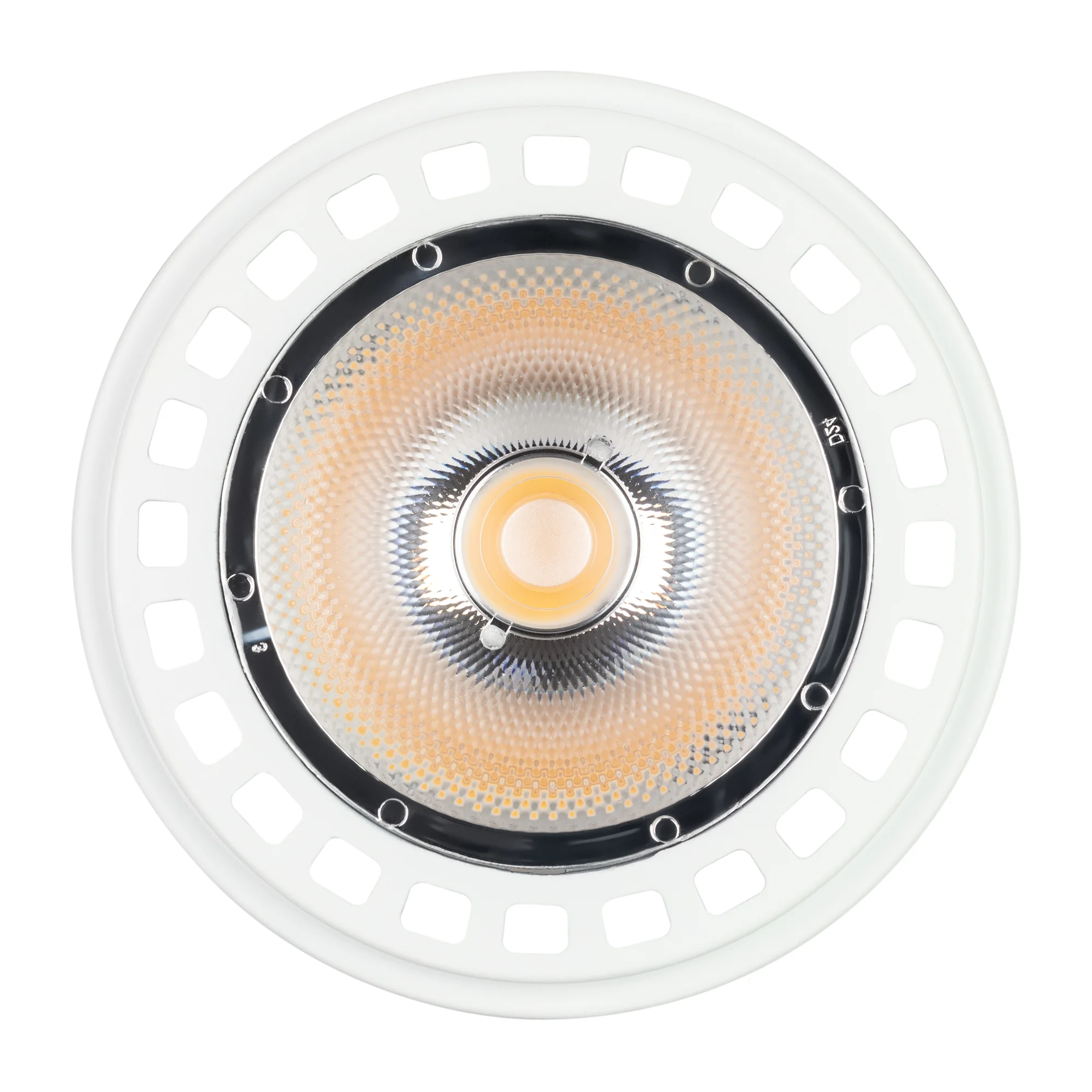 Светодиодная лампа AR111, цоколь G53, светодиод COB, цвет БЕЛЫЙ ТЕПЛЫЙ 3000K, угол 24°, мощность 15Вт, напряжение 12V, Индекс цветопередачи CRI>80 Цвет рамки белый