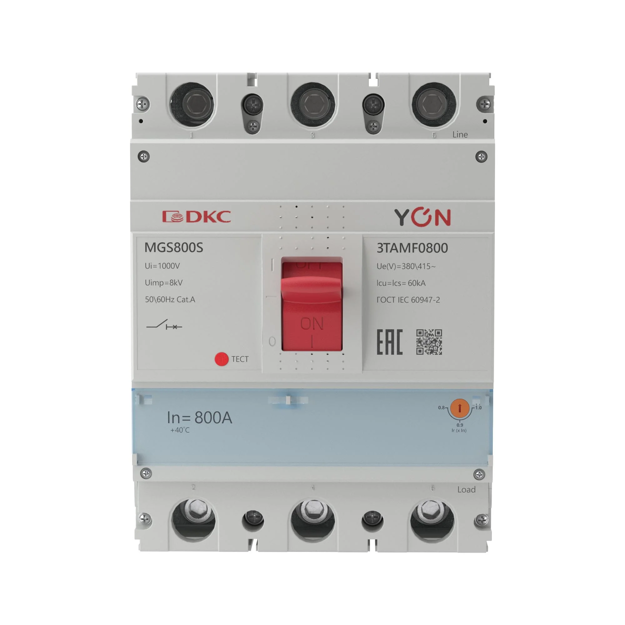 Воздушный автоматический выключатель серии YON max AGS предназначен для эксплуатации в сетях низкого напряжения до 415 В. Применяется для рабочих включений и отключений, а также для защит от перегрузок, короткого замыкания и замыкания на землю. Номинальный ток 800 А, отключающая способность 65 kA, 3-х полюсный, выкатное исполнение, расцепитель 3M, управление ручное