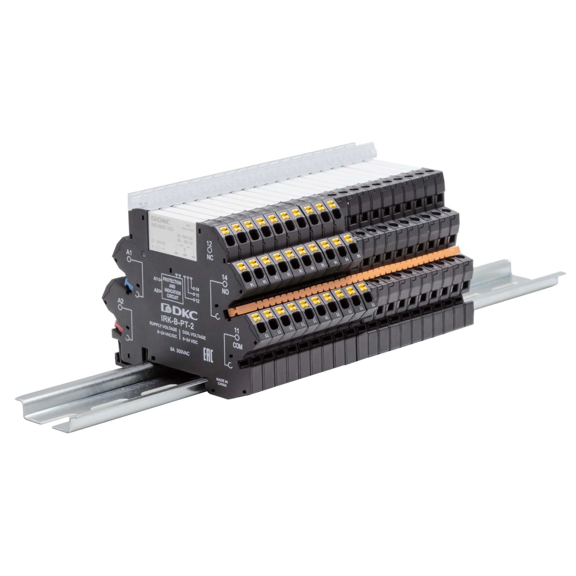 Интерфейсные реле применяются в системах промышленной автоматизации, обеспечивают коммутацию и управление различными сигнальными линиями, являются связующим устройством между датчиками, контроллерами и исполнительными механизмами. Обладают компактным размером — всего 6,3 мм шириной, 1 контактной группой (СО), универсальным напряжением питания 230 AC/DC и коммутируемым током 6А. Винтовые клеммы.