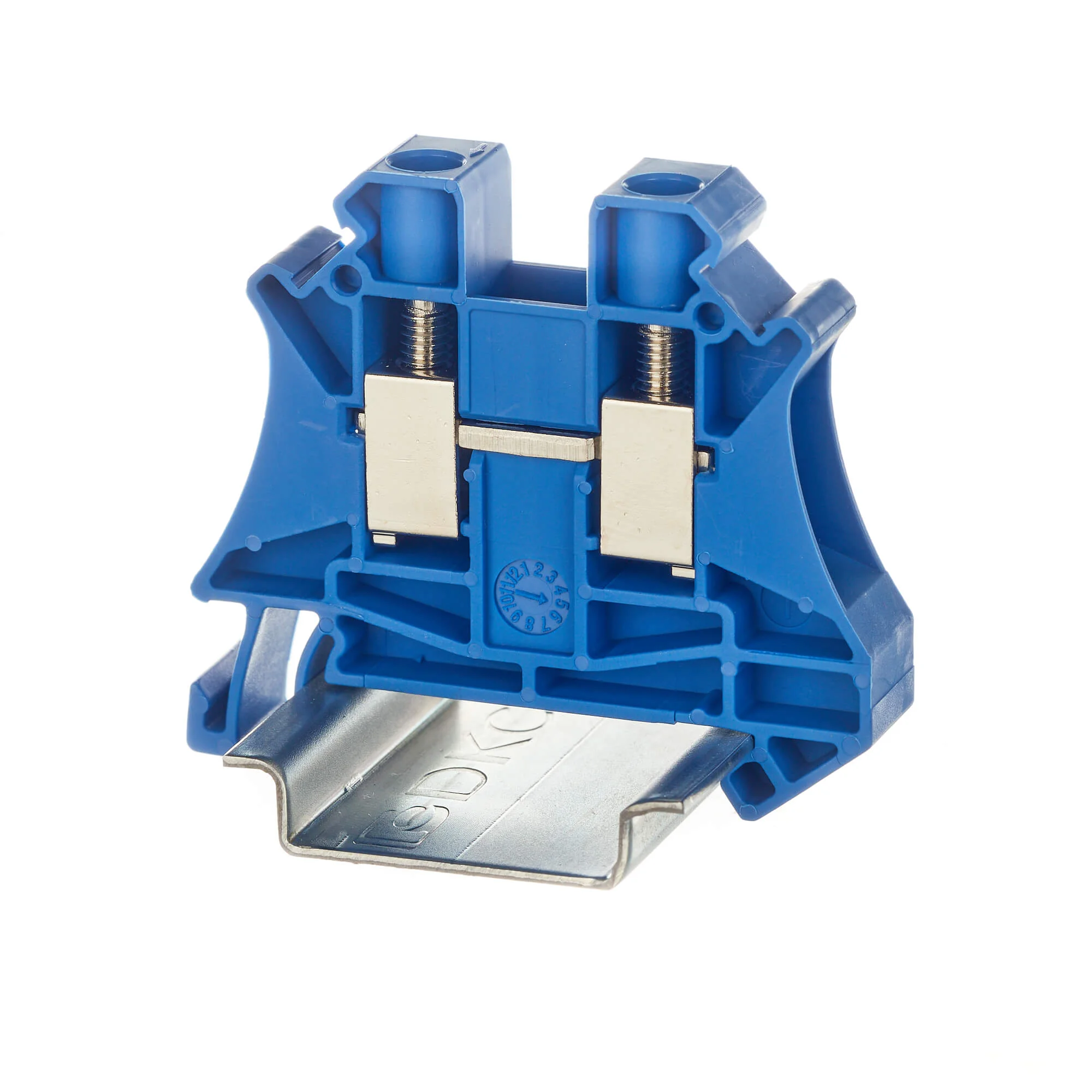 Проходная клемма с винтовым зажимом предназначена для соединения двух проводников. Монтаж на DIN-рейку OMEGA при температуре эксплуатации от -40 до +105°C. Корпус выполнен из ПА 6.6 с классом горючести V0 UL-94. Синий цвет, 2 точки подключения, 10 мм². 2 канала для вставных перемычек. Габариты (В×Ш×Г) 47,5×47,7×10,2 мм.
