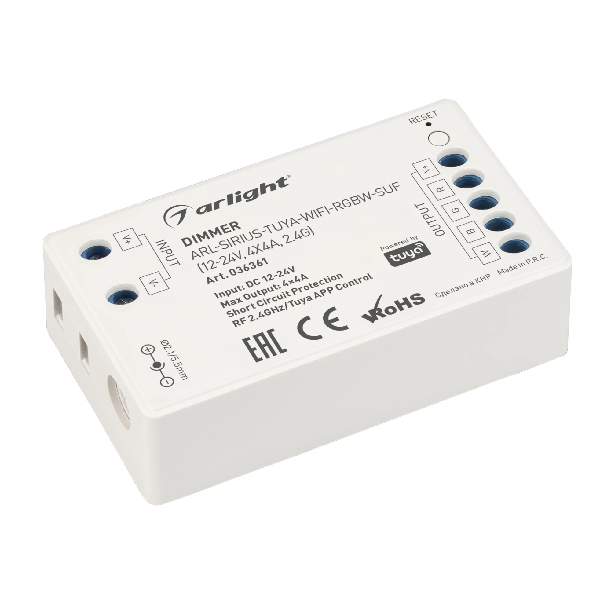 Контроллер четырёхканальный для RGBW светодиодных лент. Питание/рабочее напряжение 12-24VDC, максимальный ток 4A на канал, 4 канала, максимальная мощность 192-384W. Частота ШИМ 1.95kГц, Wi-Fi 2.4G. Винтовые клеммы. Корпус — PVC. Габариты 70х40х20 мм. Cовместим с платформой TUYA, поддерживается управление ЯНДЕКС АЛИСА. Список совместимых пультов в разделе «Совместимые».
