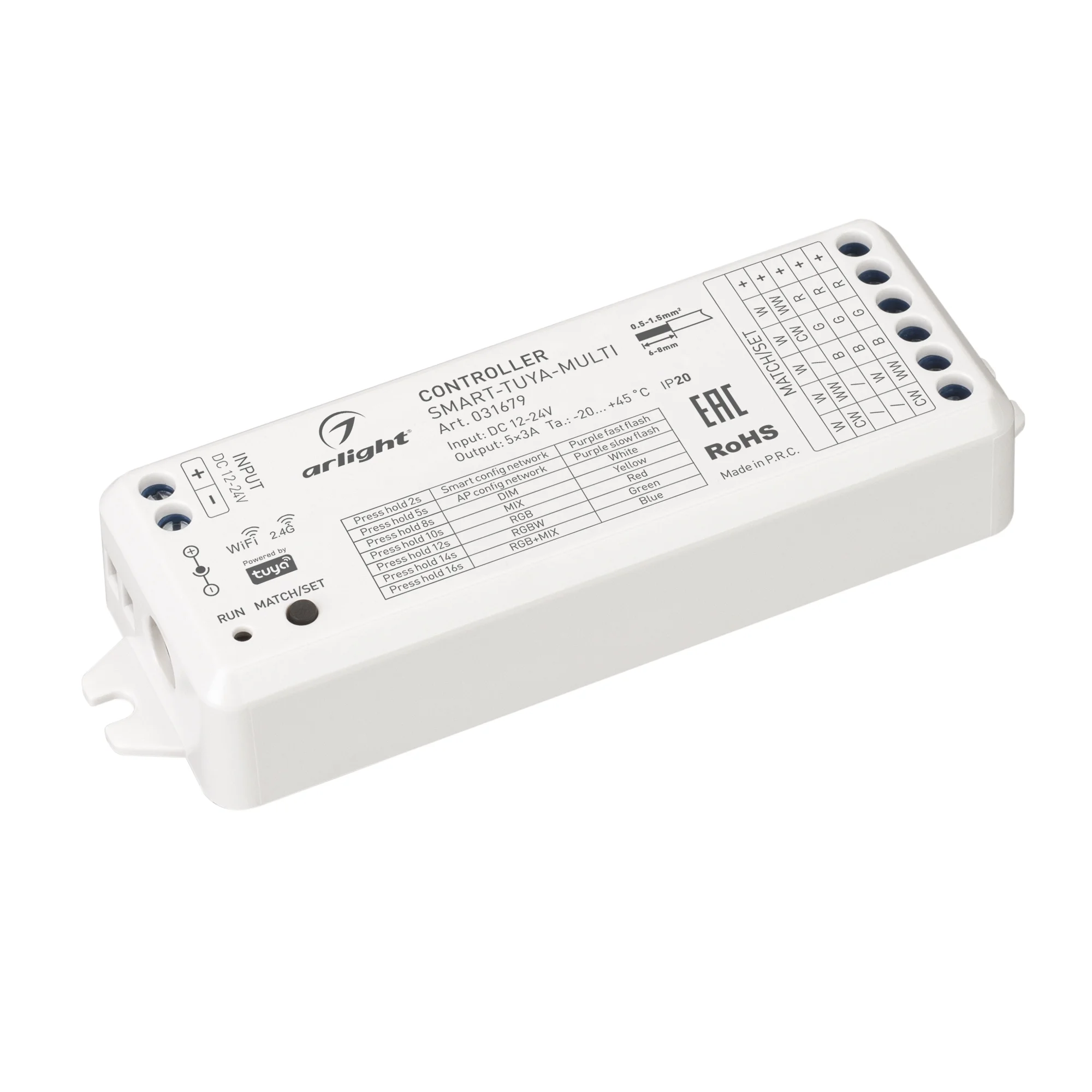 Многофункциональный 5-канальный контроллер для светодиодной RGB и MIX лент и модулей (ШИМ), интерфейс TUYA (Wi-Fi), поддерживается управление ЯНДЕКС АЛИСА, совместим с приложением SMART LIFE. Питание/рабочее напряжение 12-24VDC, максимальный ток 3A на канал, 5 каналов, максимальная мощность 180-360W. Винтовые клеммы. Корпус — PVC. Габариты 114x38x20 мм. Управляется пультами и панелями серии SMART (поставляются отдельно).