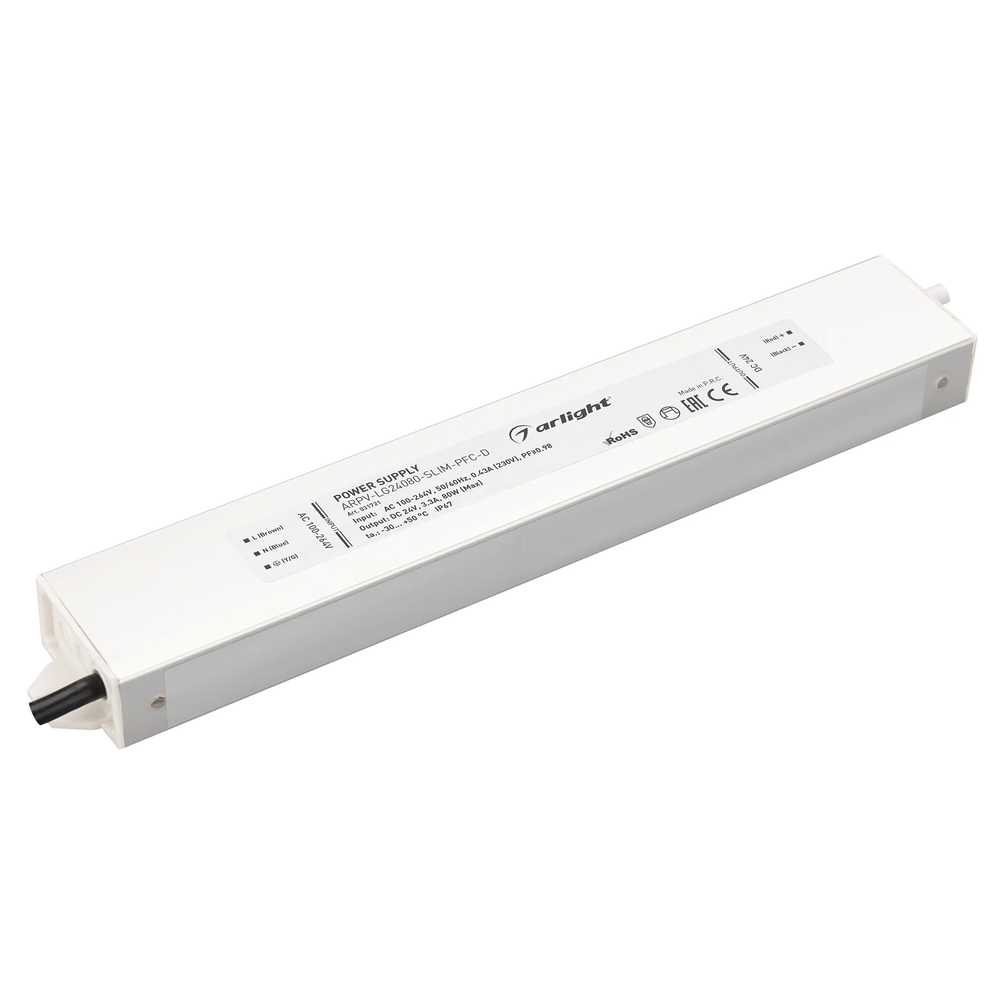 Источник напряжения с гальванической развязкой для светодиодных изделий. Входное напряжение 200-240 VAC. Выходные параметры: 24 В, 3.3 А, 80 Вт. Встроенный PFC >0.98. Герметичный алюминиевый корпус IP 67. Рабочая температура -30…+50C°. Габаритные размеры длина 258 мм, ширина 40 мм, высота 22 мм. Гарантийный срок 5 лет.