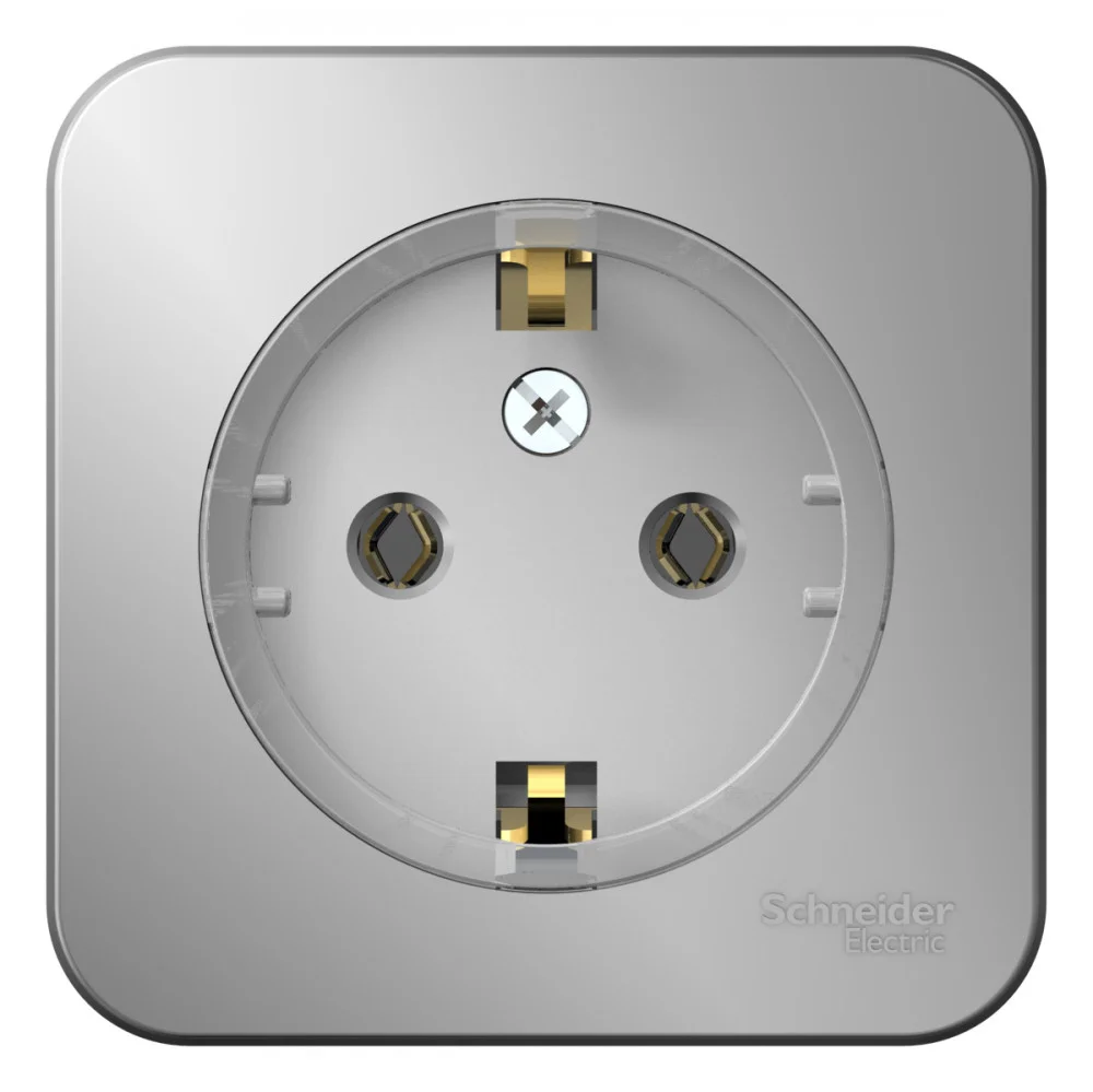 Розетка Systeme Electric (ранее Schneider Electric) BLANCA (алюминий, открытой установки) одноместная, с заземлением, без шторок предназначена для сетей до 250В, на ток до 16А. Заземление обеспечивает безопасность при косвенном прикосновении. Она изготовлена из ABS-пластика, проста в установке и удобна в применении.